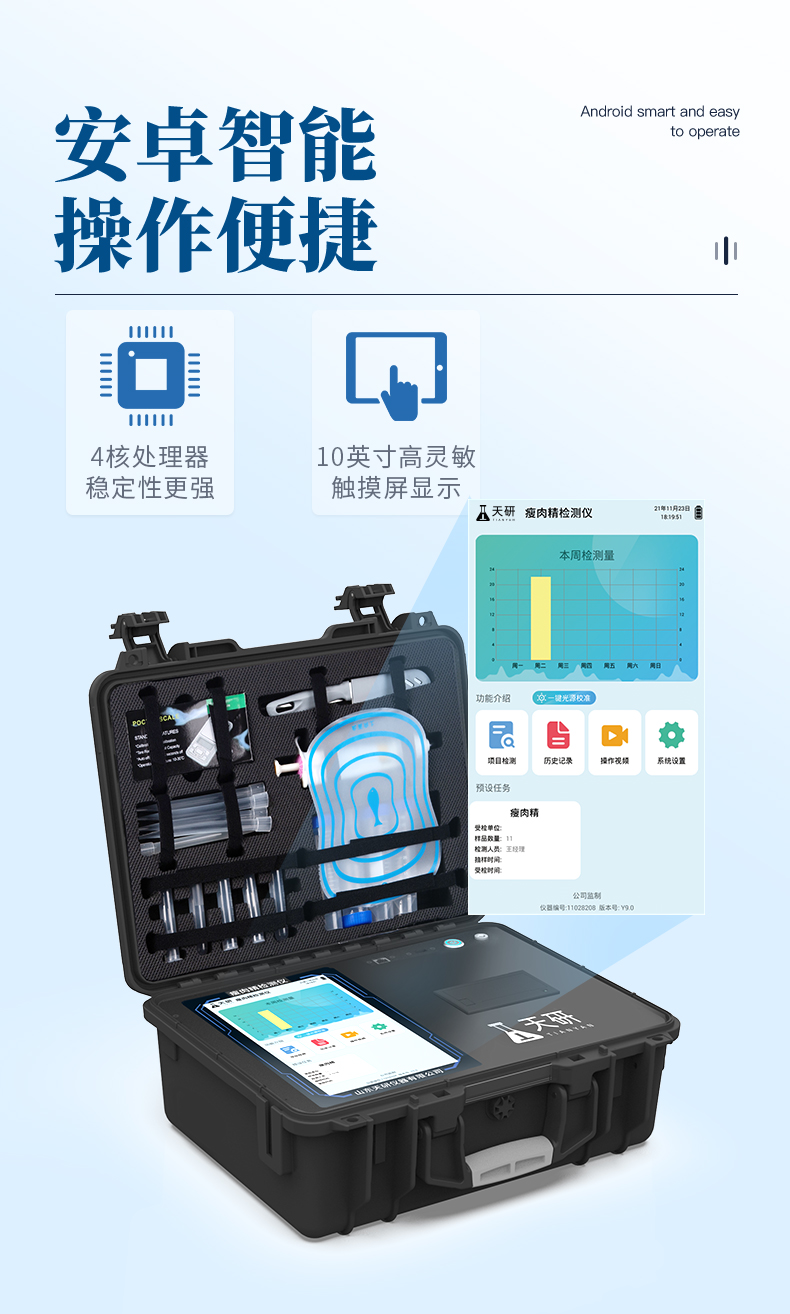 瘦肉精檢測儀可現(xiàn)場快速檢測鹽酸克倫特羅、萊克多巴胺、沙丁胺醇、己烯雌酚、喹乙醇等。儀器預(yù)留其他項目檢測程序和端口,根據(jù)日后需求可方便的自主增加檢測項目。日后可升級為檢測抗生素、獸藥殘留、動物疫病、病害肉、的綜合類型儀器