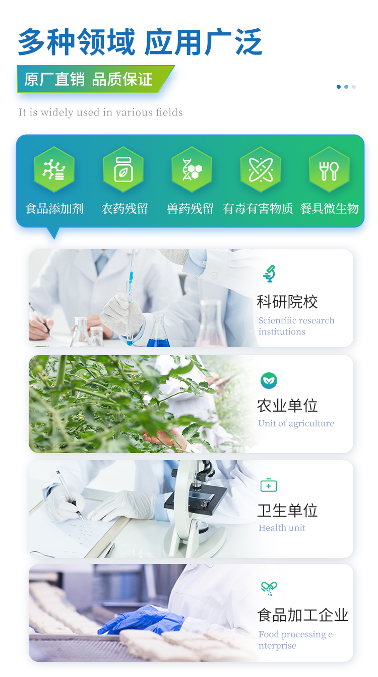 山東天研儀器有限公司生產(chǎn)的高智能食品安全檢測儀為集成化食品安全快速檢測分析設(shè)備,采用臺式一體化設(shè)計,可快速檢測200多種食品安全項目,包含非食用化學(xué)物質(zhì)、濫用食品添加劑、農(nóng)藥殘留、獸藥殘留、重金屬、病害肉、營養(yǎng)強化劑、抗生素類殘留、激素類殘留、真菌毒素類殘留、化學(xué)類殘留等項目的定性定量檢測。目前廣泛應(yīng)用于市場監(jiān)管局、檢測中心、衛(wèi)生監(jiān)督部門、農(nóng)業(yè)部門、院校及各單位食堂、食品肉產(chǎn)品深加工企業(yè)、商超市場、司法部門、餐飲機(jī)構(gòu)、養(yǎng)殖場、屠宰場、檢驗檢疫部門等單位。