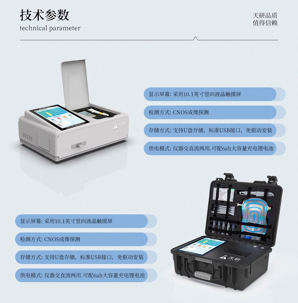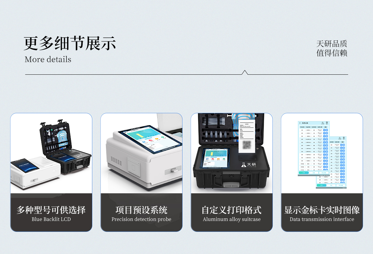 | 儀器采用手提一體化系統(tǒng)檢測技術(shù),將分光光度模塊、膠體金檢測模塊、新型農(nóng)殘檢測模塊、數(shù)字化管理模塊、無線通訊模塊高度集成于一體,支持檢測200種食品安全檢測項目,同時預(yù)留升級檢測方法。 | 儀器檢測模塊標(biāo)準(zhǔn)化、智能化,檢測項目可隨意自由組合。檢測箱體內(nèi)置多個標(biāo)準(zhǔn)檢測單元,檢測模塊可以調(diào)整配置。 | 顯示屏幕:儀器采用10.1英寸豎向液晶觸摸屏顯,搭配運行安卓智能操作系統(tǒng),主控芯片采用ARM Cortex-A7,RK3288/4核處理器,主頻1.88Ghz,操作方便,性能更強。 | 檢測通道:≥12通道;采用精密旋轉(zhuǎn)比色池設(shè)計,使用同芯片同光源校準(zhǔn)精度,解決不同光源之間的誤差值,更加準(zhǔn)確**。(1-12通道間誤差0.1%,專利號:ZL202022821055.2) | 儀器光源:高精度進(jìn)口四波長冷光源,每個通道均配置 410、520、590、630nm 波長光源,標(biāo)配**的光路切換裝置,專利光路切換功能可實現(xiàn)64波長,并且所有檢測項目可實現(xiàn)所有通道同時檢測。 | 設(shè)備可一鍵校準(zhǔn),自動保存校準(zhǔn)數(shù)據(jù),自動對比校驗,得到精準(zhǔn)光源,采用Android SP存儲數(shù)據(jù),光源數(shù)據(jù)永不丟失,方便每一次使用。 | 通訊接口:配備無線通信模塊、4G(APN)通訊模塊、藍(lán)牙傳輸,同時具有雙USB接口以及RJ45網(wǎng)線接口,可以多方式實現(xiàn)數(shù)據(jù)保存及數(shù)據(jù)傳輸。 | 存儲方式:支持U盤存儲,標(biāo)準(zhǔn)USB接口,免驅(qū)動安裝。檢測結(jié)果存儲容量20萬條以上,可生成Excel表格進(jìn)行拷貝,并具有登錄保護(hù)功能。 | 智能化操作系統(tǒng):: ★操作系統(tǒng):儀器可在同一檢測界面自動對應(yīng)相關(guān)檢測通道,一次性選擇1-12個樣品名稱,無需退出界面,節(jié)省操作時間。并可以對每個通道屬性和樣品信息單獨進(jìn)行編輯,例如送檢單位、人員,檢測人員等,打印時勾選打印顯示。 | ★數(shù)據(jù)集成系統(tǒng):設(shè)備首頁自動匯總分析檢測數(shù)據(jù),包含:周檢測數(shù)據(jù)、月檢測數(shù)據(jù),全部檢測總數(shù)量,均包含檢測總數(shù),合格數(shù),不合格數(shù),以及相關(guān)柱形分析圖,各項檢測數(shù)據(jù)一目了然,無需電腦查詢,更加快捷直觀。 | ★數(shù)據(jù)庫系統(tǒng):十幾項數(shù)據(jù)庫分類管理儀器:包含項目類型、項目數(shù)據(jù)、檢測數(shù)據(jù)、歷史記錄、國標(biāo)信息、曲線信息、采樣信息、檢測信息、受檢信息、復(fù)核信息、圖表信息、光源校準(zhǔn)信息、打印樣式信息、樣品庫信息等等,數(shù)據(jù)庫之間互相協(xié)調(diào)聯(lián)動保證數(shù)據(jù)的真實完整性。同時產(chǎn)品數(shù)據(jù)庫以及歷史檢測記錄支持一鍵檢索功能。 | ★限量規(guī)判系統(tǒng):具有限量查詢、添加物質(zhì)合規(guī)判定系統(tǒng)。檢測出結(jié)果后,系統(tǒng)自動調(diào)用系統(tǒng)數(shù)據(jù)庫中相關(guān)國標(biāo)進(jìn)行比對判定,客觀顯示判定結(jié)果是否合格 | ★項目預(yù)設(shè)系統(tǒng):儀器具有任務(wù)預(yù)設(shè)模塊,一鍵提前預(yù)設(shè),給出方便快捷的新檢測方案,每一個任務(wù)分別可以設(shè)置不同的樣品、批次、編號、來源、備注、抽樣信息、檢測信息、受檢信息、復(fù)核信息等更多信息。樣品送檢時一鍵調(diào)取保存信息,并可多次調(diào)取,大大提高檢測效率。 | ★數(shù)據(jù)監(jiān)管系統(tǒng):同步對接監(jiān)管平臺,數(shù)據(jù)可局域網(wǎng)和互聯(lián)網(wǎng)數(shù)據(jù)上傳,檢測結(jié)果可選擇直接傳至食品安全監(jiān)管平臺。進(jìn)行區(qū)域食品安全監(jiān)管及大數(shù)據(jù)分析處理與數(shù)據(jù)統(tǒng)計,檢測區(qū)域食品安全長短期動態(tài),達(dá)到食品安全問題預(yù)估、預(yù)警。 | ★打印系統(tǒng):內(nèi)置全新打印機,新創(chuàng)自定義打印方式,可按需靈活勾選控制:產(chǎn)品合格證(國家農(nóng)業(yè)部標(biāo)準(zhǔn)要求),二維碼,抽樣信息、檢測信息,受檢信息、復(fù)核信息、抽樣日期、檢測日期等信息的打印。 | 供電模式:儀器交直流兩用,直流12V供電,可連接車載電源,可配6ah大容量充電鋰電池,電量可實時顯示,方便戶外流動測試。 | 膠體金檢測模塊:采用雙通道CMOS成像處理技術(shù)及膠體金免疫層析技術(shù),可同時讀取雙膠體金卡數(shù)據(jù),自動采集、處理分析,將檢測結(jié)果顯示,并可根據(jù)參考限值自動判斷檢測結(jié)果,可檢測常見的獸藥殘留、生物毒素、抗生素、違禁添加物等。 | ★探測技術(shù):CMOS成像探測; | ★檢測通道:1個通道; | ★檢測方式:消線法和比色法; | ★顯示模式:陰性或陽性; | 曲線形式:軌道式掃描方式,顯示金標(biāo)卡圖像,實時生成、識別CT曲線圖,無需手動調(diào)整,完成檢測后自動退出檢測卡。兼容市場上其他金標(biāo)卡,使用耗材不受限制。 | 儀器具備遠(yuǎn)程升級功能,可定向分客戶分儀器更新,開機后自動更新,并可持續(xù)性免費更新系統(tǒng)版本,無需像傳統(tǒng)產(chǎn)品返廠更新,節(jié)省時間及人力成本并避免了物流運輸返廠升級導(dǎo)致設(shè)備損壞的潛在風(fēng)險。 |