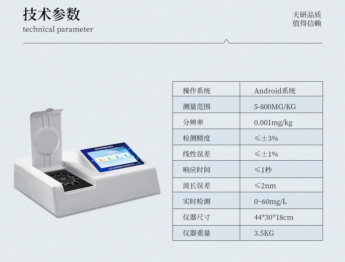 | 1、智能**且方便 | ①智能芯片:主控芯片采用ARM Cortex-A7,RK3288/4核處理器,搭配安卓智能操作系統(tǒng),集實驗操作,分析結果,打印報告等功能于一體,使用方便,性能更強。 | ②大屏顯示:采用10.1英寸液晶觸摸屏,單機即可操作,無需連接外部顯示或控制器。 | ③多樣同檢:儀器具有12個檢測通道,可同時一次性檢測11個樣品,效率更高。 | ④工作預設:具有任務預設模塊,一鍵提前預設樣品所有信息內容。來樣時可直接檢測,同時可多次調取。 | ⑤數(shù)據(jù)分析:設備首頁自動匯總分析數(shù)據(jù),并繪制柱形分析圖,各項檢測數(shù)據(jù)一目了然,快捷直觀。 | ⑥高度集成:模塊高度集合,將分光光度模塊、數(shù)字化管理模塊、無線通訊模塊集成于一體。可將檢測結果進行分析,直接上傳至數(shù)據(jù)平臺,實現(xiàn)數(shù)據(jù)共享,方便后期進行數(shù)據(jù)分析與統(tǒng)計。 | ⑦遠程升級:儀器具備遠程升級功能,可遠程升級程序,無需返廠,并可持續(xù)性免費更新系統(tǒng)版本,降低成本及運輸損耗風險。 | 2、檢測精準且直觀 | ①專利技術:精密旋轉比色池,使用同芯片同光源校準精度,解決不同光源之間存在波長誤差的問題,更加準確**。 | ②結果直觀:儀器自動對檢測結果與國標限量值進行對比,自動判定結果是否合格,結果更直觀。 | 3、功能強大且實用 | ①存儲功能:設備可以存儲數(shù)據(jù)100000組,可在屏幕上直觀查看歷史數(shù)據(jù),可導出數(shù)據(jù)。 | ②打印功能:設備自帶打印功能,可對樣品信息及檢測結果無限次隨意打印。 | ③全新方式:新創(chuàng)自定義打印方式,可按需靈活勾選控制:二維碼,抽樣信息、檢測信息,受檢信息、復核信息、抽樣日期、檢測日期等信息的打印 | ④多重編輯:樣品信息可多重編輯,可以對每個通道屬性和樣品信息單獨進行編輯,例如樣品信息、抽樣信息、檢測信息,受檢信息、復核信息、抽樣日期、檢測日期等信息等。 | ⑤雙語設計:全中文/英文操作菜單,簡單實用,適用于不同用戶的需求。 |