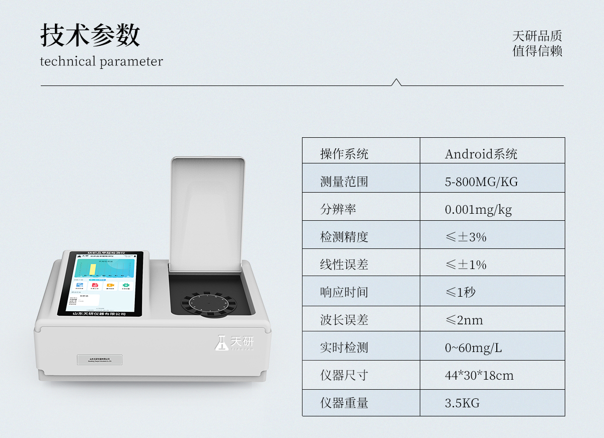 | 1、智能**且方便 | ①智能芯片:主控芯片采用ARM Cortex-A7,RK3288/4核處理器,搭配安卓智能操作系統(tǒng),集實(shí)驗(yàn)操作,分析結(jié)果,打印報(bào)告等功能于一體,使用方便,性能更強(qiáng)。 | ②大屏顯示:采用10.1英寸液晶觸摸屏,單機(jī)即可操作,無(wú)需連接外部顯示或控制器。 | ③多樣同檢:儀器具有12個(gè)檢測(cè)通道,可同時(shí)一次性檢測(cè)11個(gè)樣品,效率更高。 | ④工作預(yù)設(shè):具有任務(wù)預(yù)設(shè)模塊,一鍵提前預(yù)設(shè)樣品所有信息內(nèi)容。來(lái)樣時(shí)可直接檢測(cè),同時(shí)可多次調(diào)取。 | ⑤數(shù)據(jù)分析:設(shè)備首頁(yè)自動(dòng)匯總分析數(shù)據(jù),并繪制柱形分析圖,各項(xiàng)檢測(cè)數(shù)據(jù)一目了然,快捷直觀。 | ⑥高度集成:模塊高度集合,將分光光度模塊、數(shù)字化管理模塊、無(wú)線通訊模塊集成于一體??蓪z測(cè)結(jié)果進(jìn)行分析,直接上傳至數(shù)據(jù)平臺(tái),實(shí)現(xiàn)數(shù)據(jù)共享,方便后期進(jìn)行數(shù)據(jù)分析與統(tǒng)計(jì)。 | ⑦遠(yuǎn)程升級(jí):儀器具備遠(yuǎn)程升級(jí)功能,可遠(yuǎn)程升級(jí)程序,無(wú)需返廠,并可持續(xù)性免費(fèi)更新系統(tǒng)版本,降低成本及運(yùn)輸損耗風(fēng)險(xiǎn)。 | 2、檢測(cè)精準(zhǔn)且直觀 | ①專(zhuān)利技術(shù):精密旋轉(zhuǎn)比色池,使用同芯片同光源校準(zhǔn)精度,解決不同光源之間存在波長(zhǎng)誤差的問(wèn)題,更加準(zhǔn)確**。 | ②結(jié)果直觀:儀器自動(dòng)對(duì)檢測(cè)結(jié)果與國(guó)標(biāo)限量值進(jìn)行對(duì)比,自動(dòng)判定結(jié)果是否合格,結(jié)果更直觀。 | 3、功能強(qiáng)大且實(shí)用 | ①存儲(chǔ)功能:設(shè)備可以存儲(chǔ)數(shù)據(jù)100000組,可在屏幕上直觀查看歷史數(shù)據(jù),可導(dǎo)出數(shù)據(jù)。 | ②打印功能:設(shè)備自帶打印功能,可對(duì)樣品信息及檢測(cè)結(jié)果無(wú)限次隨意打印。 | ③全新方式:新創(chuàng)自定義打印方式,可按需靈活勾選控制:二維碼,抽樣信息、檢測(cè)信息,受檢信息、復(fù)核信息、抽樣日期、檢測(cè)日期等信息的打印 | ④多重編輯:樣品信息可多重編輯,可以對(duì)每個(gè)通道屬性和樣品信息單獨(dú)進(jìn)行編輯,例如樣品信息、抽樣信息、檢測(cè)信息,受檢信息、復(fù)核信息、抽樣日期、檢測(cè)日期等信息等。 | ⑤雙語(yǔ)設(shè)計(jì):全中文/英文操作菜單,簡(jiǎn)單實(shí)用,適用于不同用戶(hù)的需求。 |