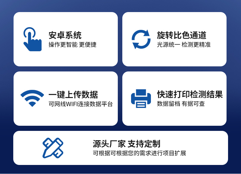 | 安卓智能操作系統(tǒng),采用更加**和人性化操作,儀器具有無線聯(lián)網(wǎng)上傳功能,快速上傳數(shù)據(jù),進(jìn)行數(shù)據(jù)統(tǒng)計(jì)和分析。 | 智能化程度高,儀器具有自檢功能:具有開機(jī)自檢和調(diào)零功能,具有自動(dòng)檢測(cè)重復(fù)性功能;同時(shí),檢測(cè)完成可自動(dòng)打印檢測(cè)報(bào)告和二維碼。手機(jī)掃碼可顯示出詳細(xì)檢測(cè)信息。 | 儀器帶有監(jiān)管平臺(tái),數(shù)據(jù)可局域網(wǎng)和互聯(lián)網(wǎng)數(shù)據(jù)上傳,檢測(cè)結(jié)果直接傳至食品安全監(jiān)管平臺(tái)。進(jìn)行區(qū)域食品安全監(jiān)管及大數(shù)據(jù)分析處理與數(shù)據(jù)統(tǒng)計(jì),檢測(cè)區(qū)域食品安全長短期動(dòng)態(tài),達(dá)到食品安全問題預(yù)估、預(yù)警 。 | 樣品處理簡單省力,整體操作快速、安全、便捷。 | 儀器具有自身保護(hù)功能,可設(shè)置用戶名及密碼,防止非工作人員操作等。 | 內(nèi)置強(qiáng)大的數(shù)據(jù)庫,可在儀器上直接選擇樣品名稱、檢測(cè)指標(biāo)、送檢單位等信息,也可在儀器上直接編輯錄入樣品名稱、檢測(cè)指標(biāo)、送檢單位等信息并保存進(jìn)樣品數(shù)據(jù)庫,方便后期操作調(diào)取使用。 | 儀器具有重新校準(zhǔn)、鎖定、恢復(fù)出廠設(shè)置功能。 |