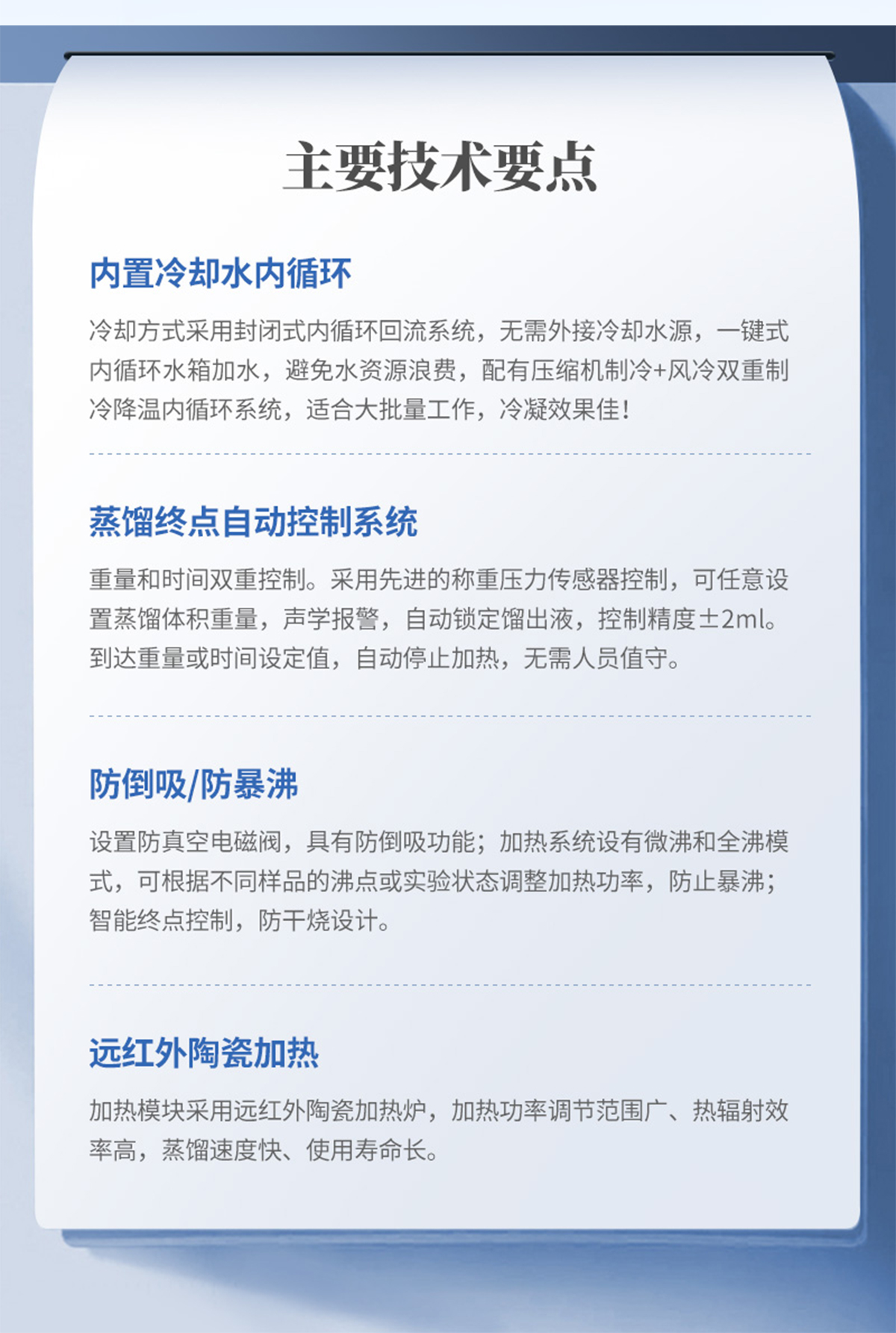 | 1、加熱方式:采用遠(yuǎn)紅外陶瓷加熱爐,紅外線輻射加熱(無明火加熱、防水); | 2、加熱單元:6個(gè),可單孔單控制; | 3、升溫時(shí)間:5-8min; | 4、蒸餾速度:2-12ml/min; | 5、蒸餾終點(diǎn)控制:自動(dòng)偵測(cè)蒸餾終點(diǎn)功能,采用稱重和時(shí)間雙重控制,蒸餾體積控制在±2ml之內(nèi),自動(dòng)化程度高; | 6、單爐加熱功率:0-450W(單孔可調(diào)); | 7、加熱功率:0-2700W(可調(diào)); | 8、冷卻方式:封閉式內(nèi)循環(huán)回流系統(tǒng),也可外接冷卻水源; | 9、防倒吸:設(shè)有防真空電磁閥,具有防倒吸功能; | 10、時(shí)間控制:0-200min可調(diào); | 11、蒸餾瓶規(guī)格:500mlX6,250 X6 更多規(guī)格可選; | 12、額定電壓/頻率:220V/50HZ; |