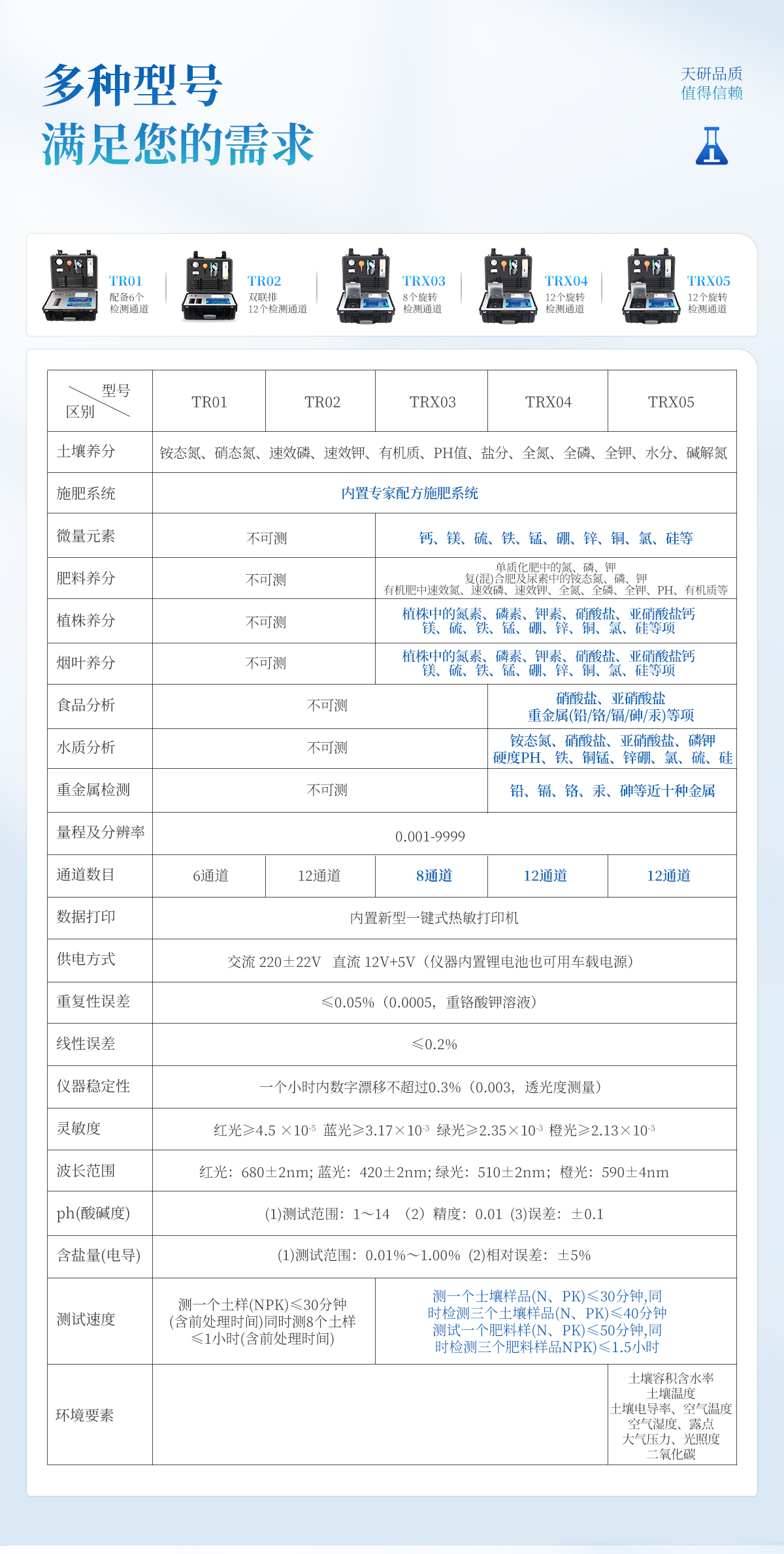 | 土壤養(yǎng)分:土壤銨態(tài)氮、土壤有效磷、土壤速效鉀、土壤硝態(tài)氮、土壤水解氮、土壤全氮、土壤全磷、土壤全鉀、土壤有機(jī)質(zhì)(丘林法)、土壤有機(jī)質(zhì)(浸提法)、土壤總有機(jī)碳、土壤碳氮比、PH值、含鹽量、水分。 | 土壤中微量元素:土壤鈣、土壤鎂、土壤硫、土壤硅、土壤硼、土壤鐵、土壤銅、土壤錳、土壤鋅、土壤氯、土壤鉬; | 土壤重金屬:土壤鉛、土壤砷、土壤鎘、土壤鉻、土壤汞、土壤鎳、土壤鋁、土壤氟、土壤鈦、土壤硒。 |