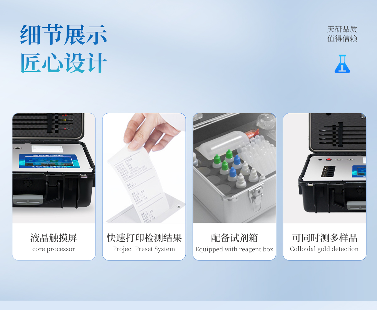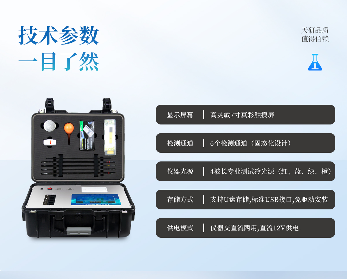 | 配套齊全:該儀器集藥、器、儀為一體,攜帶方便,相當(dāng)于一個(gè)小型移動(dòng)實(shí)驗(yàn)室,無(wú)需用戶自配附件,亦可靈活野外流動(dòng)測(cè)試。適于農(nóng)業(yè)服務(wù)部門或農(nóng)資經(jīng)銷商、合作社、肥料廠商、大種植戶測(cè)土施肥。 | 檢測(cè)功能全:測(cè)試項(xiàng)目國(guó)內(nèi)外全面,除標(biāo)配試劑外,其他各類藥劑均可加配選購(gòu)。 | 操作簡(jiǎn)便、速度快捷,配套整套附件及成品藥劑開(kāi)瓶即用,無(wú)須配置。 |
