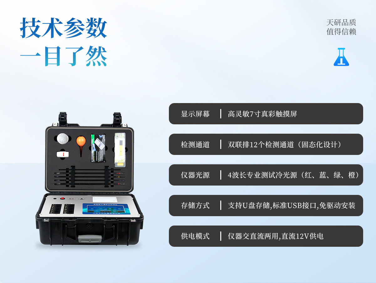 | 1、本儀器集各功能于一身,無需用戶自配附件,可靈活流動檢測。 | 2、安卓(Android)智能操作系統(tǒng),主控芯片采用ARM Cortex-A7,RK3288/4核處理器,主頻1.88Ghz,運轉(zhuǎn)速度更快速,穩(wěn)定性更強。 | 3、雙聯(lián)排12個檢測通道(固態(tài)化設計),一次性可快速檢測12個樣品,極大提升檢測效率,降低檢測成本。 | 4、檢測過程中內(nèi)置校準功能,智能恒流穩(wěn)壓,光強自動校準,確保檢測準確度。 | 5、內(nèi)置作物專家施肥系統(tǒng),可對百余種全國農(nóng)業(yè)經(jīng)濟作物、果樹等的目標產(chǎn)量計算推薦施肥量,依據(jù)施肥配方科學指導農(nóng)業(yè)生產(chǎn)。測土配方施肥結果可打印,打印內(nèi)容包含:作物種類、肥料種類、目標產(chǎn)量、需求總量、建議施肥方案。 | 6、儀器標配wifi無線上傳、4G聯(lián)網(wǎng)傳輸、GPRS無線遠傳功能,快速上傳數(shù)據(jù)。 | 7、儀器內(nèi)置大容量內(nèi)存,支持查看全部歷史檢測記錄,以及傳輸所有檢測數(shù)據(jù)。 | 8、配有智慧云農(nóng)業(yè)平臺,儀器連入無線網(wǎng)絡后,可將檢測數(shù)據(jù)可選擇性或批量無線上傳,方便用戶進行長期數(shù)據(jù)管理和可視化分析。 | 9、儀器配同時具有USB接口、以太網(wǎng)接口,并可隨時用U盤拷貝出數(shù)據(jù)。 | 10、可用手機隨時登錄云平臺在線移動查看歷史數(shù)據(jù) | 11、內(nèi)置植物營養(yǎng)診斷標準圖譜,根據(jù)各農(nóng)作物營養(yǎng)缺失的圖片,進行葉面對比,診斷豐缺。 | 12、4波長專業(yè)測試冷光源(紅、藍、綠、橙),光源波長穩(wěn)定,長時間連續(xù)工作光源無溫漂現(xiàn)象,壽命長達10萬小時級別,重現(xiàn)性好,準確度高。 | 13、比色池部分采用標準1cm比色皿,無機械位移及磨損,光路測試定位**,有效屏蔽外光干擾,保證檢測結果優(yōu)于國標要求。 | 14、儀器系統(tǒng)內(nèi)帶有樣品前處理操作視頻,各種樣品檢測方法點擊視頻模塊即可觀看,檢測人員無需自學說明書,指導教學方便快速,方便新手快速操作。 | 15、內(nèi)置新一代高速熱敏打印機(無需色帶),打印內(nèi)容包含:檢測單位、檢測人員、檢測項目、通道號、吸光度、養(yǎng)分含量(mg/kg)、檢測時間、以及二維碼等信息 | 16、高靈敏7寸真彩觸摸屏,采用更加**和人性化操作,高清晰高交互顯示,大程度降低傳統(tǒng)儀器的繁瑣操作和失誤。 | 17、內(nèi)置時鐘功能,方便操作時間記錄,長期歷史追溯。 | 18、可設置多賬戶賬號密碼登錄,**UI交互界面,不同的用戶可自由添加編輯檢測信息,保存后可長期使用。 | 19、GPS功能:可在野外作業(yè)時記錄經(jīng)緯度地點,滿足特殊用戶需求。 | 20、內(nèi)置低電壓提示功能,可在檢測時明確電量,避免測試數(shù)據(jù)偏移,同時具有斷電保護功能,斷電自動保存數(shù)據(jù),防止數(shù)據(jù)丟失。 | 21、交直流兩用供電方式,內(nèi)置大容量充電鋰電池,滿電狀態(tài)下可連續(xù)工作10余小時,同時可外接車載電源蓄電。 | 22、儀器具有中英文切換功能,可滿足出口要求。 | 23、高強度PVC工程塑料手提箱設計,堅固耐用,便于攜帶。 |