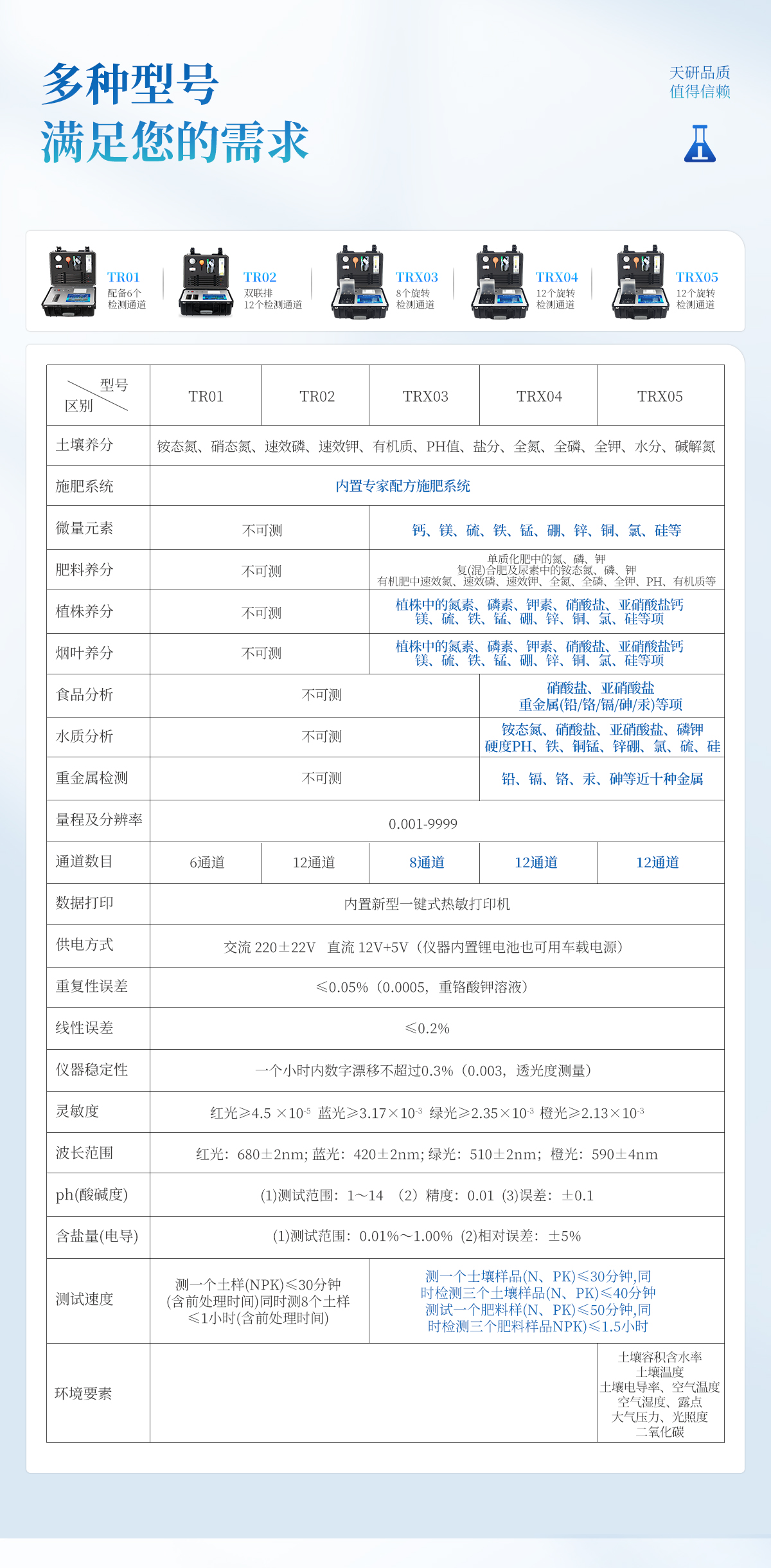 | 配套齊全:該儀器集藥、器、儀為一體,攜帶方便,相當于一個小型移動實驗室,無需用戶自配附件,亦可靈活野外流動測試。適于農(nóng)業(yè)服務部門或農(nóng)資經(jīng)銷商、合作社、肥料廠商、大種植戶測土施肥。 | 檢測功能全:測試項目國內(nèi)外全面,除標配試劑外,其他各類藥劑均可加配選購。 | 操作簡便、速度快捷,配套整套附件及成品藥劑開瓶即用,無須配置。 |