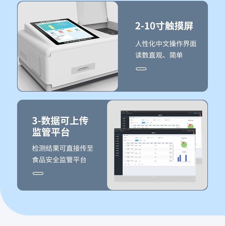 | 儀器采用臺(tái)式一體化系統(tǒng)檢測技術(shù),將分光光度模塊、新型農(nóng)殘檢測模塊、數(shù)字化管理模塊、無線通訊模塊高度集成于一體,支持檢測200種食品安全檢測項(xiàng)目,同時(shí)預(yù)留升級(jí)檢測方法。 | 儀器檢測模塊標(biāo)準(zhǔn)化、智能化,可隨意自由組合。檢測箱體內(nèi)置多個(gè)標(biāo)準(zhǔn)檢測單元,檢測模塊可以調(diào)整配置。 | 儀器采用全新安卓智能系統(tǒng),主控芯片采用 ARM Cortex-A7,RK3288/4核處理器,10.1寸高清液晶觸摸豎屏,更加**的UI交互界面,運(yùn)轉(zhuǎn)快捷;儀器配備無線通信模塊: 4G(APN)通訊模塊、Wifi模塊,藍(lán)牙傳輸,同時(shí)具有雙USB接口以及RJ45接口能以多種方式實(shí)現(xiàn)數(shù)據(jù)保存和數(shù)據(jù)傳輸功能。 | 創(chuàng)新檢測模式: | ★檢測通道:≥12通道;采用精密旋轉(zhuǎn)比色池設(shè)計(jì),使用同芯片同光源校準(zhǔn)精度,解決不同光源之間的誤差值。1-12通道間誤差0.1%。(專利號(hào):ZL202022821055.2) | ★儀器具有自動(dòng)識(shí)別比色皿檢測功能,即:將樣品比色皿放入儀器后,點(diǎn)擊樣品檢測,儀器自動(dòng)識(shí)別比色皿進(jìn)行通道檢測。 | 進(jìn)口高精光源: | 高精度進(jìn)口四波長冷光源,通道配置 410、520、590、630nm 波長光源,一個(gè)光源芯片驅(qū)動(dòng)一個(gè)光源,誤差極小,每臺(tái)設(shè)備單獨(dú)**校準(zhǔn)光源,**比對(duì),同時(shí)參照四種不同波段光源全方位覆蓋市面上99%的農(nóng)殘食品項(xiàng)目檢測。 | 智能化操作系統(tǒng): | 便捷操作系統(tǒng):設(shè)備檢測時(shí)可在同一檢測界面自動(dòng)對(duì)應(yīng)相關(guān)檢測通道一次性選擇1-12個(gè)樣品名稱,無須退出界面,節(jié)省操作時(shí)間。 | 數(shù)據(jù)集成系統(tǒng):設(shè)備首頁自動(dòng)統(tǒng)計(jì)檢測數(shù)據(jù)包含:周檢測數(shù)據(jù)、月檢測數(shù)據(jù),全部檢測總數(shù)量,均包含檢測總數(shù),合格數(shù),不合格數(shù),以及相關(guān)柱形分析圖,對(duì)各項(xiàng)檢測數(shù)據(jù)清晰掌握,無需電腦查詢,更加快捷直觀。 | 項(xiàng)目預(yù)設(shè)系統(tǒng):支持添加單個(gè)及多個(gè)相同或不相同的任務(wù)預(yù)設(shè),一鍵快速調(diào)取,每一個(gè)任務(wù)分別可以設(shè)置不同的樣品、批次、編號(hào)、來源、備注、抽樣信息、檢測信息、受檢信息、復(fù)核信息等更多信息。無縫鏈接平臺(tái)和APP實(shí)時(shí)查看下發(fā)任務(wù)。 | 數(shù)據(jù)監(jiān)管系統(tǒng):同步對(duì)接監(jiān)管平臺(tái),數(shù)據(jù)可局域網(wǎng)和互聯(lián)網(wǎng)數(shù)據(jù)上傳,檢測結(jié)果可選擇直接傳至食品安全監(jiān)管平臺(tái)。集成OSS輸出存儲(chǔ)服務(wù)、區(qū)分設(shè)備定向管理應(yīng)用,進(jìn)行區(qū)域食品安全監(jiān)管及大數(shù)據(jù)分析處理與數(shù)據(jù)統(tǒng)計(jì),檢測區(qū)域食品安全長短期動(dòng)態(tài),達(dá)到食品安全問題預(yù)估、預(yù)警。 | 自定義打印系統(tǒng):內(nèi)置全新打印系統(tǒng),新創(chuàng)自定義打印方式,可按需靈活設(shè)置開啟或關(guān)閉:產(chǎn)品合格證(國家農(nóng)業(yè)部標(biāo)準(zhǔn)要求),二維碼,抽樣信息、檢測信息,受檢信息、復(fù)核信息、抽樣日期、檢測日期等信息的打印。 | 系統(tǒng)遠(yuǎn)程更新功能:可定向分客戶分儀器更新系統(tǒng),按照不同客戶后期實(shí)際需求添加項(xiàng)目,無需機(jī)器返廠,即可遠(yuǎn)程實(shí)時(shí)升級(jí)全新系統(tǒng),節(jié)省時(shí)間成本及避免運(yùn)輸造成設(shè)備損壞。 | 儀器主機(jī)采用一體化防水、抗壓、防撞擊、防腐蝕箱體設(shè)計(jì),同時(shí)配備交直流供電,可連接車載電源,可選配大容量充電鋰電池,滿足現(xiàn)場野外檢測需求。 | 安全證書,放心保障:儀器具有中國計(jì)量科學(xué)研究院校準(zhǔn)證書,**認(rèn)證。 |