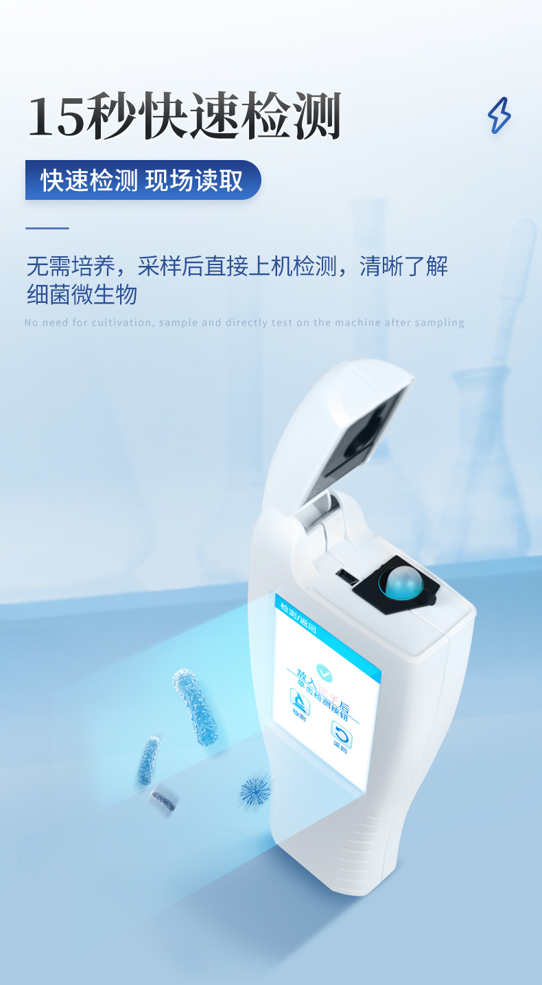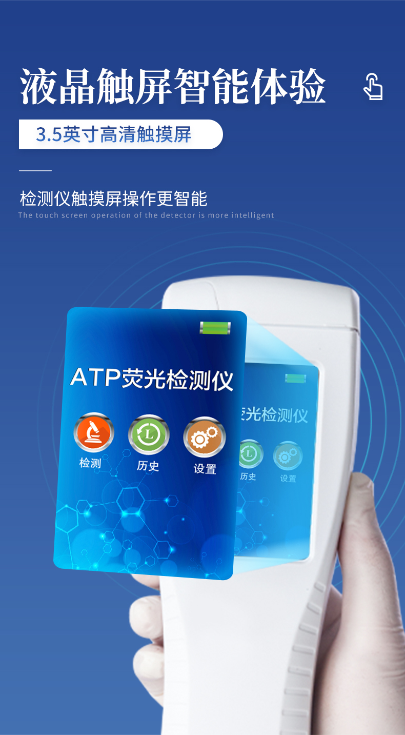 該設(shè)備為全新升級(jí)產(chǎn)品,大屏幕觸摸顯示屏,代替?zhèn)鹘y(tǒng)按鍵。操作采用生物化學(xué)反應(yīng)方法檢測(cè)ATP含量,ATP熒光檢測(cè)儀基于螢火蟲發(fā)光原理,利用“熒光素酶—熒光素體系”快速檢測(cè)三磷酸腺苷(ATP)。ATP拭子含有可以裂解細(xì)胞膜的試劑,能將細(xì)胞內(nèi)ATP釋放出來,與試劑中含有的特異性酶發(fā)生反應(yīng),產(chǎn)生光,再用熒光照度計(jì)檢測(cè)發(fā)光值,微生物的數(shù)量與發(fā)光值成正比,由于所有生物活細(xì)胞中含有恒量的ATP,所以ATP含量可以清晰地表明樣品中微生物與其他生物殘余的多少,用于判斷衛(wèi)生狀況。