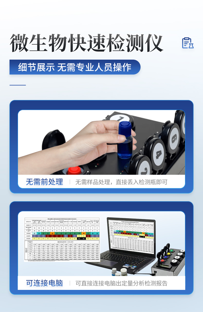 | 實(shí)用性 —— 可根據(jù)環(huán)境檢測(cè)需求設(shè)定上下限值,做到數(shù)據(jù)快速評(píng)估預(yù)警,表面潔凈度快速篩查。 | 速度快 —— 常規(guī)培養(yǎng)法18-24h以上,而ATP只需要十幾秒鐘 . | 可行性 —— 微生物數(shù)量與微生物體內(nèi)所含ATP有明確的相關(guān)性。 通過檢測(cè)ATP含量,可間接得出反應(yīng)中微生物數(shù)量 | 可操作性 —— 傳統(tǒng)培養(yǎng)方法需要在實(shí)驗(yàn)室由經(jīng)過培訓(xùn)的技術(shù)人員進(jìn)行操作;而ATP快速潔凈度檢測(cè)操作非常簡(jiǎn)便,只需簡(jiǎn)單的培訓(xùn)即可由一般工作人員進(jìn)行現(xiàn)場(chǎng)操作。 | 體驗(yàn)更好 —— 試子套管采用插拔式靈活設(shè)計(jì),可定期清洗長(zhǎng)期使用,延長(zhǎng)儀器壽命。 |