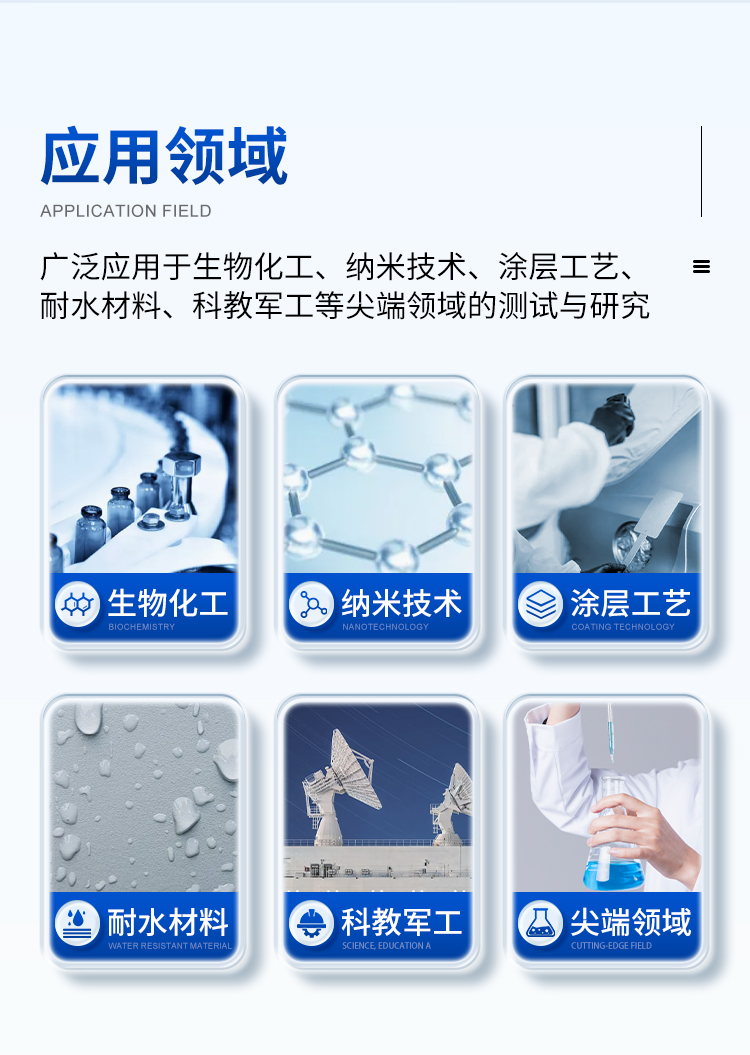 本機(jī)除了利用停滴法測試靜態(tài)接觸角外,更側(cè)重于利用傾斜板法測試和分析動態(tài)接觸角(包括前進(jìn)接觸角、后退接觸角和滾動角);同時也可以測試液體表面張力、估算固體表面能和分析潤濕性。廣泛應(yīng)用于生物化工、納米技術(shù)、涂層工藝、耐水材料、科教軍工等尖端領(lǐng)域的測試與研究。