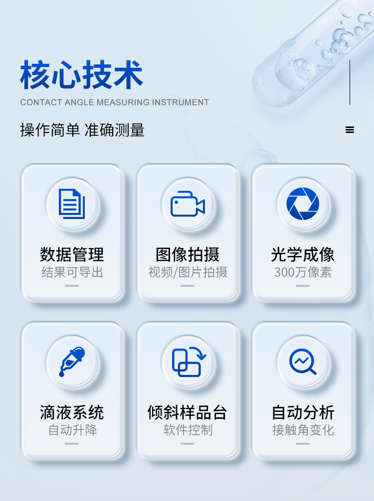 功能概述: 本機(jī)用于測(cè)試和分析液體在固體表面的接觸角、液體的表面張力、固體的表面能等。實(shí)現(xiàn)對(duì)固體表面的親/疏水性分析、潤(rùn)濕性分析、潔凈度檢測(cè)、處理工藝效果評(píng)估,以及液體被競(jìng)爭(zhēng)、吸附、吸收和鋪展等過程分析。廣泛應(yīng)用于化工、醫(yī)藥、食品、電子、印染、噴涂、軍工和科教等眾多領(lǐng)域的測(cè)試與研究。