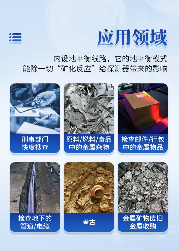 | (1)公安刑事部門快度搜查 | (2)檢測(cè)原料、燃料、食品中的 金屬雜物 | (3)檢查郵件、行包中的金屬物品 | (4)檢查地下的管道、電纜 | (5)考古 | (6)發(fā)現(xiàn)隱埋在地下的金銀寶物和金屬礦物廢舊金屬收購 |