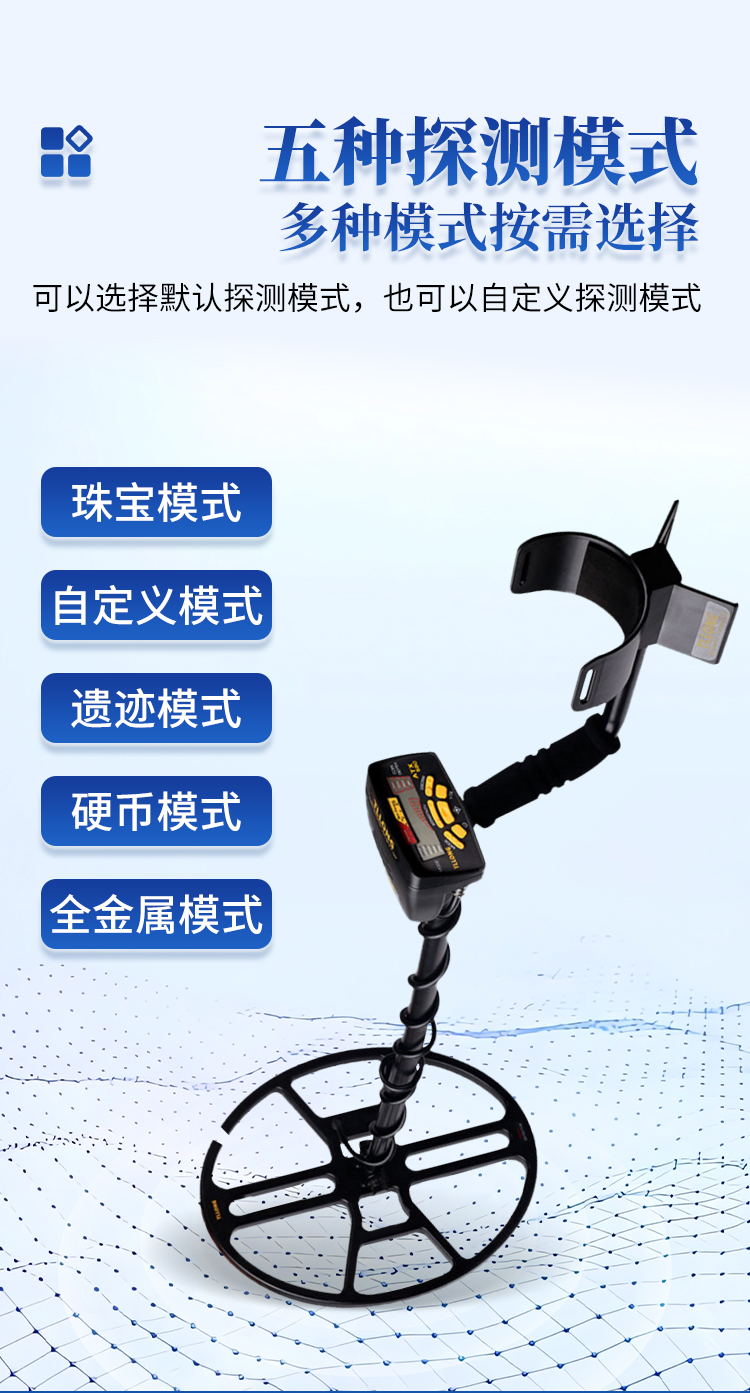 | ●探測(cè)盤:全新配置一款15存“DD”防水探測(cè)盤,可以擴(kuò)大該儀器的探測(cè)范圍 | ●識(shí)別能力:可以單項(xiàng)區(qū)分金,銀,銅,鐵等 | ●聲音識(shí)別能力:金、銀、銅、鐵的報(bào)警聲音可以完全區(qū)分 | ●高靈敏度:提高了更強(qiáng)的探測(cè)靈敏度,增加機(jī)器的探測(cè)深度 | ●耳機(jī):配置一個(gè)原廠配置的高清耳機(jī) | ●定位: 可以快速的定位地下金屬的準(zhǔn)確位置 | ●接收/拒絕:通過識(shí)別按鈕可以進(jìn)行單項(xiàng)選擇探測(cè),例如:選擇黃金,該儀器只對(duì)黃金進(jìn)行報(bào)警 | ●硬幣深度顯示:在主機(jī)的右側(cè)有個(gè)顯示小金屬的深度 | ●電量狀況顯示: 可以顯示電源現(xiàn)有的電量 | ●定位按鈕: 可以精準(zhǔn)定位金屬的位置 | ●五種探測(cè)模式: 可以選擇默認(rèn)探測(cè)模式,也可以自定義探測(cè)模式 | 珠寶模式(可以刪除鐵,找到細(xì)小的金屬,比如戒指,耳環(huán),項(xiàng)鏈等) | 自定義模式(可以單項(xiàng)選擇性探測(cè),選擇自己想要探測(cè)的金屬類型) | 遺跡模式(可以將鐵刪除,只探測(cè)有色金屬提高地下金屬探測(cè)效率) | 硬幣模式(這種識(shí)別模式的目的是排除酸性垃圾,許多拉環(huán)和標(biāo)簽紙檢) | 全金屬模式(可以探測(cè)所有的金屬、金、銀、銅、鐵等) |