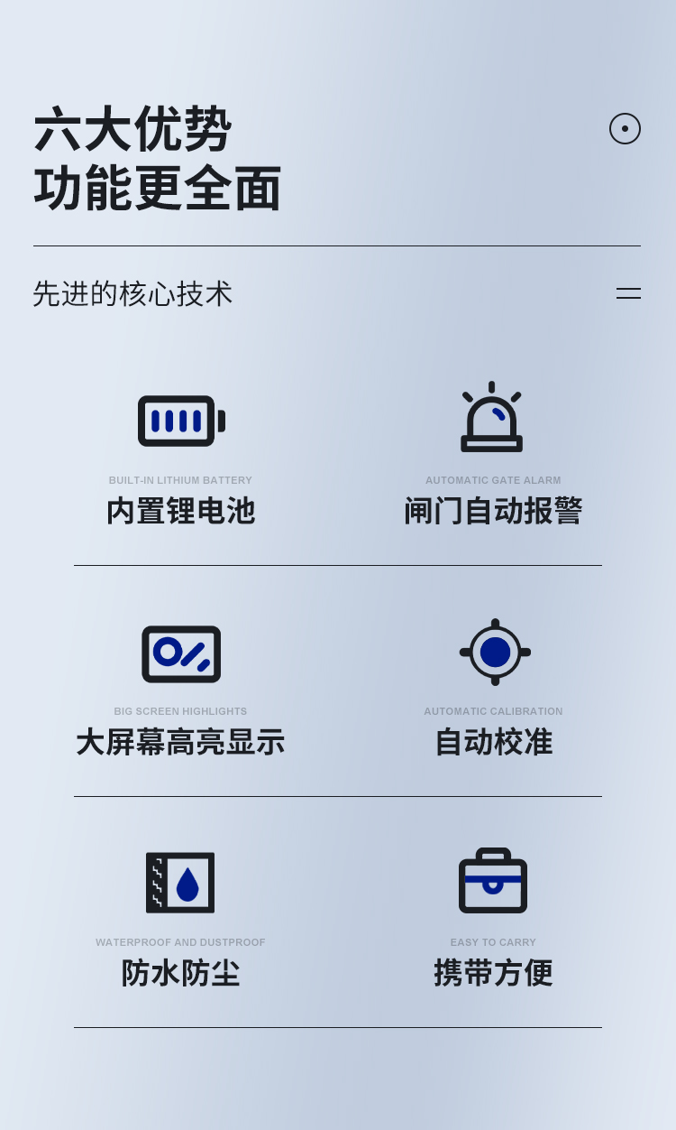 | ● 閘門聲光報警。 | ● 自動增益功能提升探傷效率; | ● 斜探頭角度和K值兩種輸入方式; | ● 峰值記憶和回波包絡(luò)快速確定**回波; | ● USB接口連接PC端進行數(shù)據(jù)傳輸,自動生成探傷報告; |