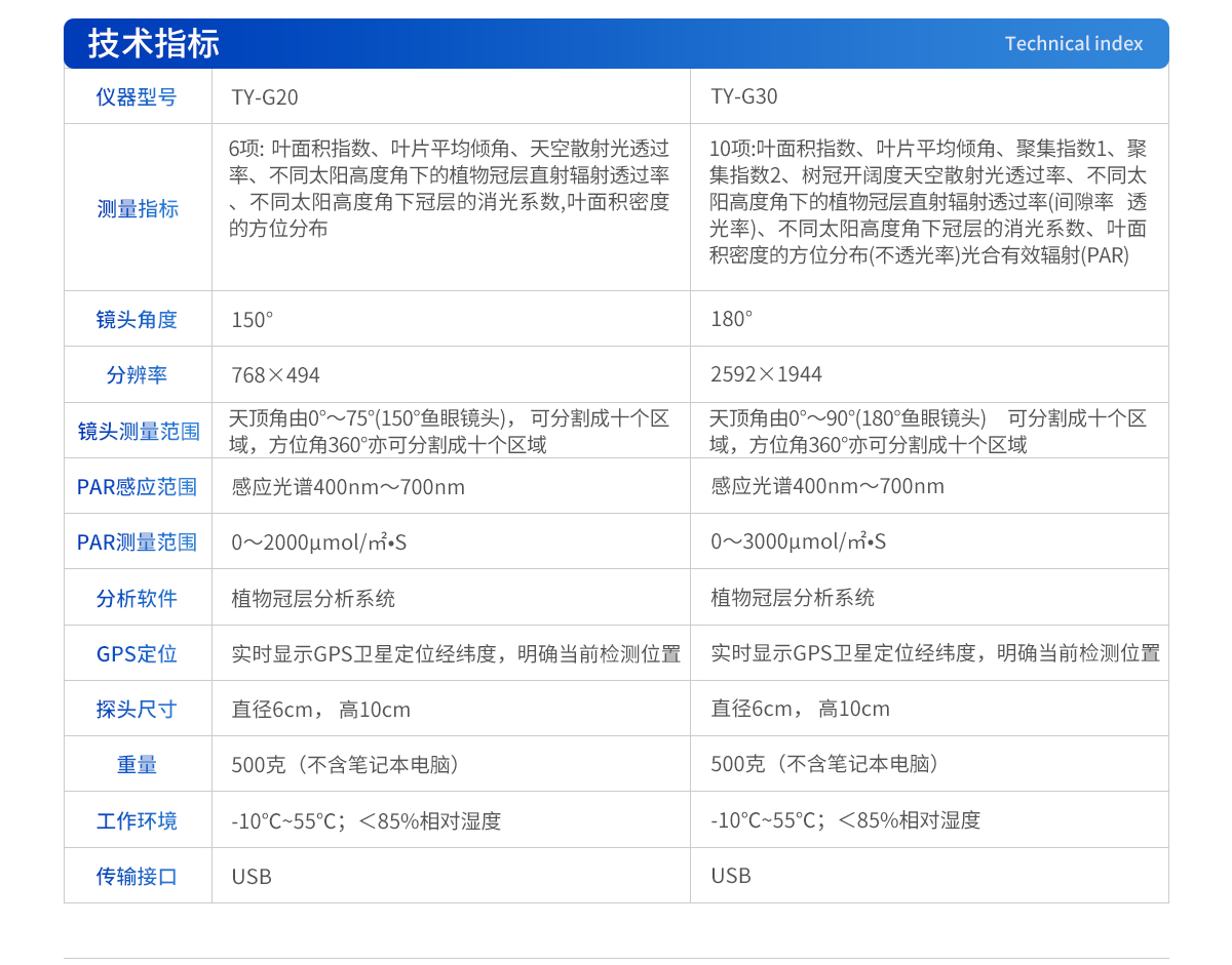 | 1.鏡頭角度:150° | 2.分辨率:768×494 | 3.測(cè)量范圍:天頂角由0°~75°(150°魚眼鏡頭)可分割成十個(gè)區(qū)域,方位角360°亦可分割成十個(gè)區(qū)域 | 4.PAR感應(yīng)范圍:感應(yīng)光譜400nm~700nm | 5.測(cè)量范圍0~2000μmol/㎡?S | 6.實(shí)時(shí)顯示GPS衛(wèi)星定位經(jīng)緯度,明確當(dāng)前檢測(cè)位置 | 7.檢測(cè)結(jié)果可直接傳至專屬云農(nóng)業(yè)數(shù)據(jù)中心,配備專屬云農(nóng)業(yè)數(shù)據(jù)中心賬戶 | 8.分析軟件:植物冠層分析系統(tǒng) | 9.探頭尺寸:直徑6cm,高10cm | 10.總 重 量:500克(不含筆記本電腦) | 11.傳輸接口:USB | 12.工作溫度:0~55℃ |