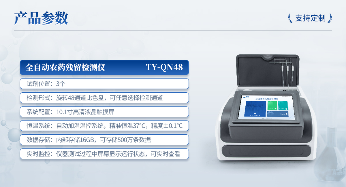 | 1. 試劑位置:3個(gè) | 2. 檢測(cè)形式:旋轉(zhuǎn)48通道比色盤(pán),可任意選擇檢測(cè)通道,自動(dòng)對(duì)應(yīng)選擇通道。 | 3. 系統(tǒng)配置:10.1寸高清液晶觸摸屏,采用ARM Cortex-A7,RK3288/4核處理器,運(yùn)行內(nèi)存1GB。Android7.1.1 系統(tǒng)分辨率1280×800。 | 4.恒溫系統(tǒng):具有自動(dòng)加溫溫控系統(tǒng),精準(zhǔn)恒溫37℃,精度±0.1℃。 | 5.添加系統(tǒng):儀器按照試劑要求自動(dòng)、按時(shí)、按量加入試劑,并且自動(dòng)對(duì)未正常放置的樣本或異常的樣本進(jìn)行檢查并提示。 | 6.清洗功能:儀器具備回流及自動(dòng)清洗管路功能,避免試劑污染。 | 7.混勻功能:設(shè)備具備自動(dòng)混勻功能。 | 8.光源校準(zhǔn):設(shè)備可自動(dòng)校準(zhǔn),確保檢測(cè)準(zhǔn)確度。 | 9.實(shí)時(shí)監(jiān)控:儀器測(cè)試過(guò)程中屏幕顯示運(yùn)行狀態(tài),可實(shí)時(shí)查看。 | 10.數(shù)據(jù)存儲(chǔ):內(nèi)部存儲(chǔ)16GB,可存儲(chǔ)500萬(wàn)條數(shù)據(jù)。 | 11.樣品多選功能:設(shè)備具備樣品一鍵多選功能,選擇樣品自動(dòng)匹配檢測(cè)通道。 | 12.項(xiàng)目預(yù)設(shè):可提前設(shè)置單個(gè)及多個(gè)相同或不相同的檢測(cè)任務(wù),可單次或者多次調(diào)取,減少檢測(cè)時(shí)間。 | 13.自定義打印系統(tǒng):內(nèi)置自定義打印系統(tǒng),可按需靈活設(shè)置開(kāi)啟或關(guān)閉:產(chǎn)品合格證(國(guó)家農(nóng)業(yè)部標(biāo)準(zhǔn)),二維碼,抽樣信息、檢測(cè)信息,受檢信息等信息的打印。 | 14.A4版本報(bào)告打印功能:設(shè)備可自動(dòng)生成A4版報(bào)告,A4報(bào)告帶二維碼,可掃描二維碼生成電子版,并可識(shí)別真?zhèn)巍?/td> | 15.傳輸方式:儀器配備無(wú)線通信模塊: 4G(APN)通訊模塊、Wifi模塊,藍(lán)牙傳輸模塊,同時(shí)具有USB接口以及RJ45接口能以多種方式實(shí)現(xiàn)數(shù)據(jù)保存和數(shù)據(jù)傳輸功能,設(shè)備數(shù)據(jù)可以同步上傳至平臺(tái)。 | 16.數(shù)據(jù)監(jiān)管系統(tǒng):設(shè)備自帶監(jiān)管平臺(tái),并可同步對(duì)接監(jiān)管平臺(tái),數(shù)據(jù)可局域網(wǎng)和互聯(lián)網(wǎng)數(shù)據(jù)上傳,檢測(cè)結(jié)果可直接傳至食品安全監(jiān)管平臺(tái)。達(dá)到食品安全問(wèn)題預(yù)估、預(yù)警。 | 17.系統(tǒng)遠(yuǎn)程更新功能:無(wú)需設(shè)備返廠,即可遠(yuǎn)程實(shí)時(shí)升級(jí)全新系統(tǒng),節(jié)省時(shí)間成本及避免運(yùn)輸造成設(shè)備損。 |