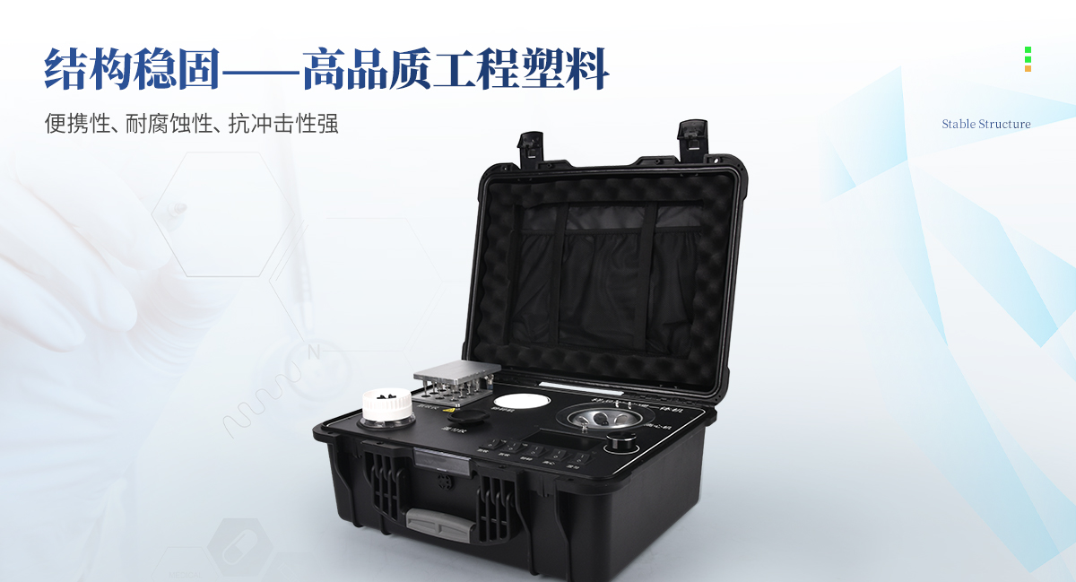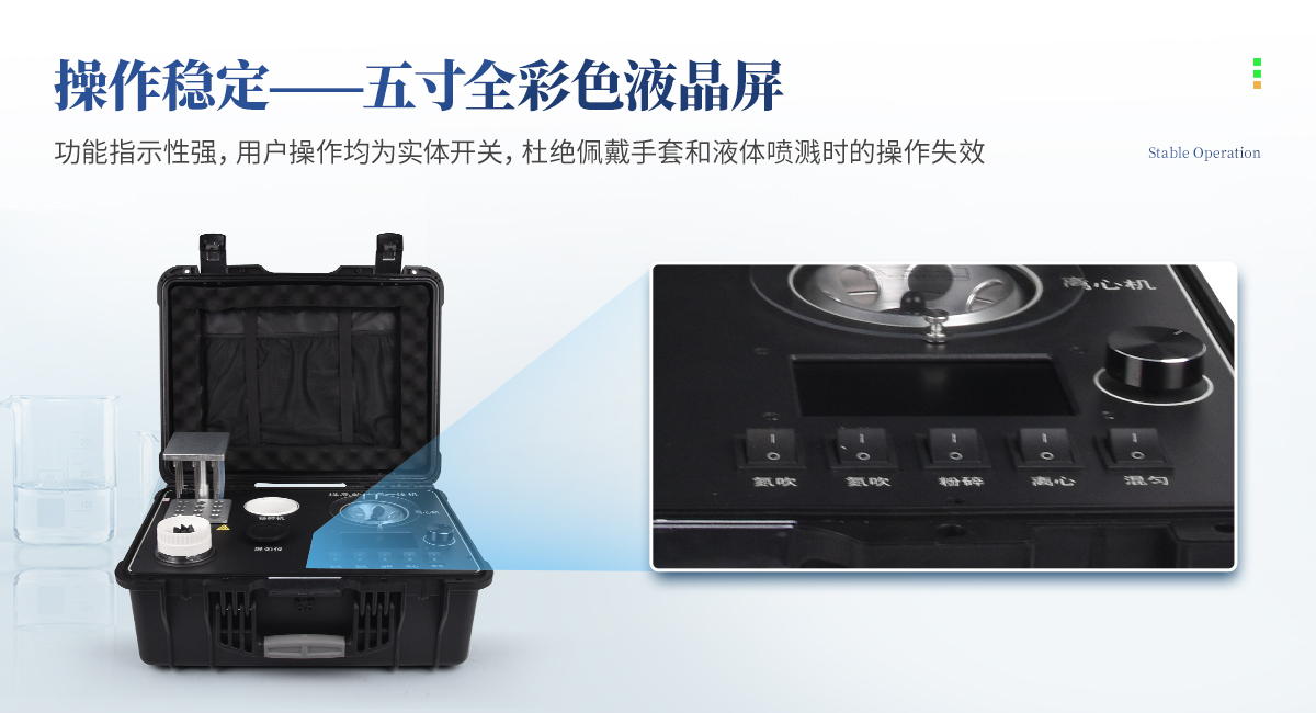 | 1、功能緊湊,集成四種樣品前處理常用的功能,完成樣品一站式處理。 | 2、結構穩(wěn)固,機箱采用***工程塑料,具備**的抗沖擊性、耐腐蝕性、便攜性。 | 3、操作穩(wěn)定,機器采用五寸全彩色液晶屏,功能指示性強,用戶操作均為實體開關,杜絕佩戴手套和液體噴濺時的操作失效。 |