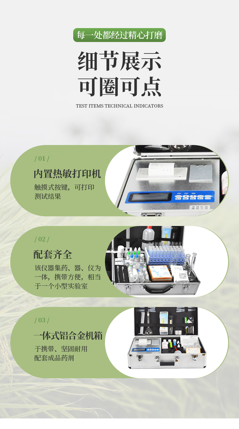 | 1、《機(jī)箱/藥劑一體式鋁合金機(jī)箱》設(shè)計(jì),便于攜帶、堅(jiān)固耐用,配套成品藥劑。 | 2、微電腦控制,數(shù)字化線路、程序化設(shè)計(jì),液晶顯示,交直流兩用,可野外流動(dòng)測試,大程度降低操作者的失誤和勞動(dòng)強(qiáng)度。 | 3、分辨率:0.001,觸摸式按鍵,內(nèi)置熱敏打印機(jī),可打印測試結(jié)果。 | 4、可檢測土壤及化肥、有機(jī)肥、植株中的速效氮、有效磷、速效鉀、全氮、全磷、全鉀、有機(jī)質(zhì)含量,土壤酸堿度,含鹽量(擴(kuò)展)。 | 5、土壤養(yǎng)分速測儀采用高亮度 LED 燈作為光源, 硅半導(dǎo)體作為信號(hào)接收系統(tǒng), 壽命長達(dá)10萬小時(shí)級(jí)別。光源穩(wěn)定,一致性好。 | 6、比色槽部分采用單通道、雙光路設(shè)計(jì),無機(jī)械位移及磨損,光路測試定位**,保證測定結(jié)果精度。 |