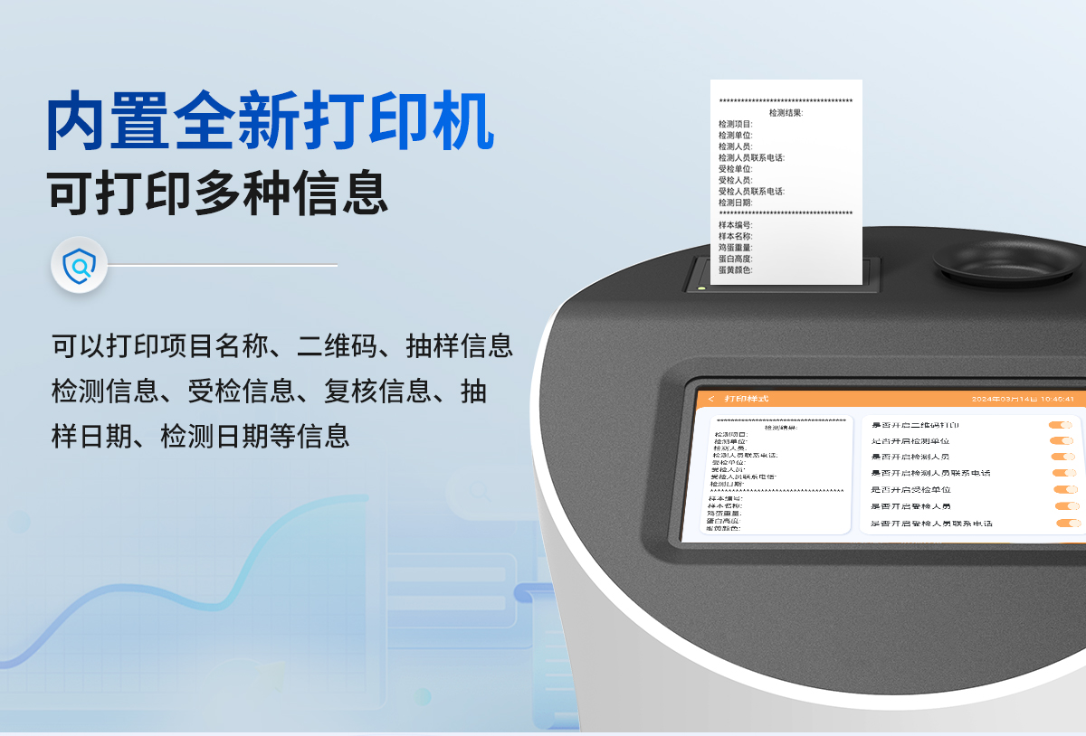 | 11. 哈夫單位模式、蛋重模式、蛋白高度模式蛋黃高度模式和蛋殼厚度模式自動(dòng)切換,探針接觸到蛋液時(shí)顯示蛋白高度,探針接觸到蛋殼時(shí)顯示蛋殼厚度。 | 12. 自動(dòng)編制樣品編號(hào)功能 |