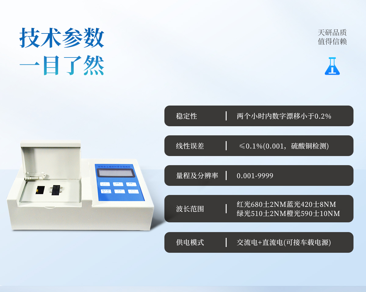 | 電源:交流 220±22V 直流 12V+5V(可用車載電源也可選擇儀器內(nèi)置鋰電池) | 功率: ≤5W | 量程及分辨率:0.001-9999 | 重復(fù)性誤差: ≤0.02%(0.0002,重鉻酸鉀溶液) | 儀器穩(wěn)定性:兩個(gè)小時(shí)內(nèi)數(shù)字漂移小于0.2%(0.002,透光度測(cè)量)。儀器開機(jī)預(yù)熱5分鐘后,一個(gè)小時(shí)內(nèi)顯示數(shù)字無漂移(透光度測(cè)量),兩個(gè)小時(shí)內(nèi)數(shù)字漂移不超過0.2%(0.002,透光度測(cè)量)。 | 線性誤差: ≤0.1%(0.001,硫酸銅檢測(cè)) | 靈敏度:紅光≥4.5 ×10-5 藍(lán)光≥3.17×10-3 綠光≥2.35×10-3 橙光≥2.13×10-3 | 波長范圍 :紅光:680±2nm; 藍(lán)光:420±2nm;綠光:510±2nm;橙光:590±10nm | PH值(酸堿度): (1)測(cè)試范圍:1~14 (2)精度:0.01 (3)誤差:±0.1 | 肥料中氮(N)、磷(P)、鉀(K)等養(yǎng)分同時(shí)、快速、準(zhǔn)確檢測(cè) | 測(cè)試速度:測(cè)一個(gè)肥料樣(N、P、K)≤50分鐘(含前處理時(shí)間,不需用戶提供任何附件) | 同時(shí)測(cè)5個(gè)肥料樣≤2小時(shí)(含前處理時(shí)間) | 數(shù)據(jù)打?。簝?nèi)置新型一鍵式熱敏打印機(jī) | 預(yù)留232數(shù)據(jù)接口,可與電腦相連進(jìn)行數(shù)據(jù)傳輸。 |