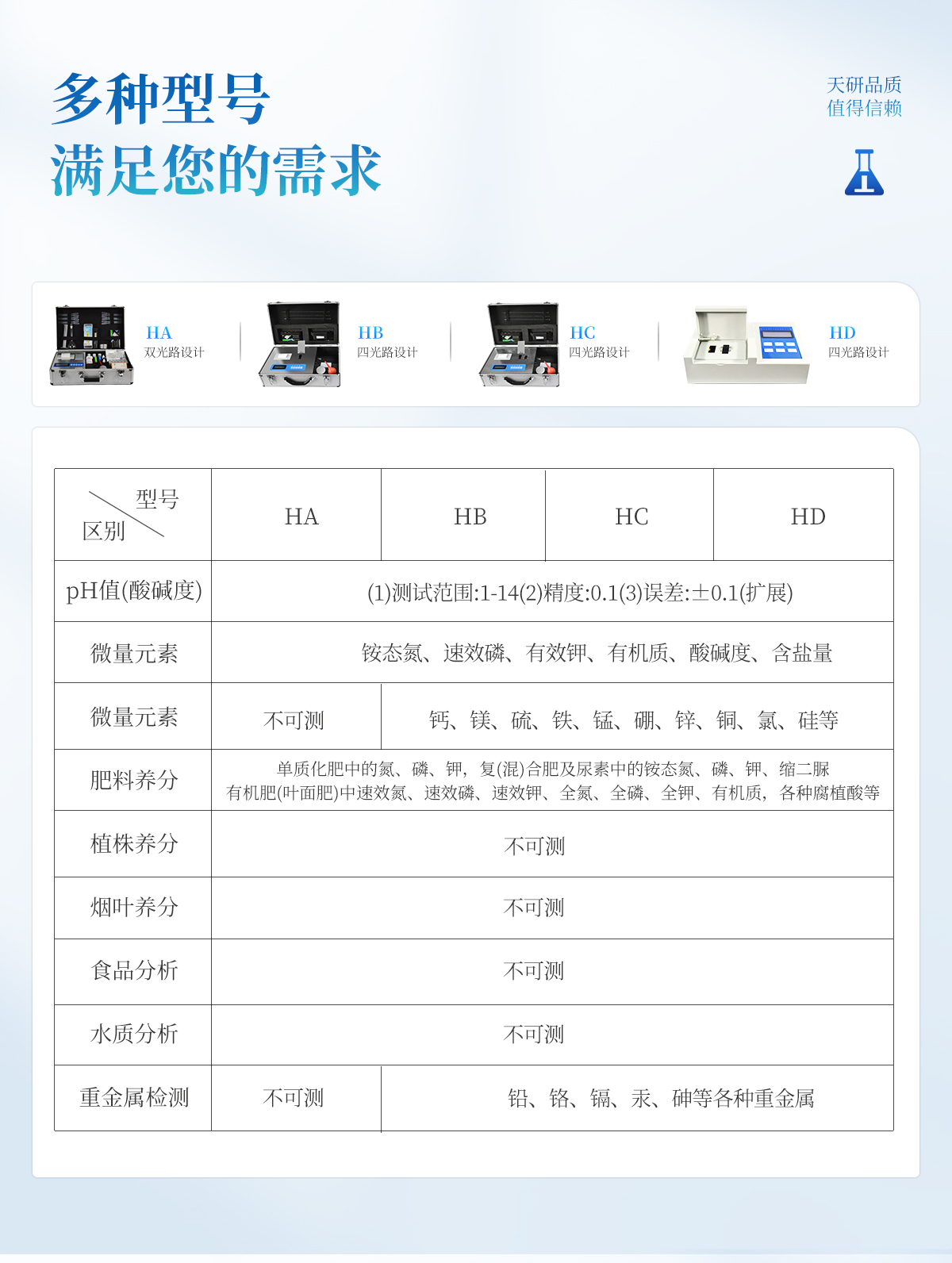 | 肥料養(yǎng)分:● 單質(zhì)化肥中的氮、磷、鉀; ● 復(fù)(混)合肥及尿素中的銨態(tài)氮、硝態(tài)氮、磷、鉀、縮二脲; ● 有機(jī)肥(葉面肥)中速效氮、速效磷、速效鉀、全氮、全磷、全鉀、有機(jī)質(zhì),各種腐植酸等??蓴U(kuò)展檢測(cè)鈣、鎂、硫、鐵、錳、硼、鋅、銅、氯、硅等微量元素以及各種重金屬(鉛鉻鎘汞砷)。 |