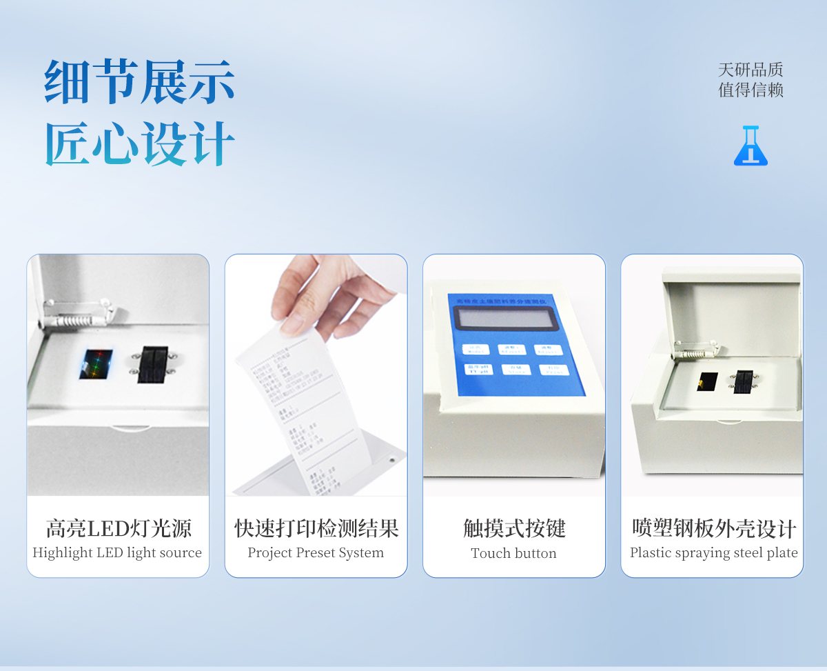 | 升級(jí)款,噴塑鋼板外殼設(shè)計(jì),堅(jiān)固耐用,配套成套附件及成品藥劑。 | 微電腦控制,數(shù)字化線路、程序化設(shè)計(jì),液晶顯示,交直流兩用,可野外流動(dòng)測(cè)試。 | 分辨率:0.001,觸摸式按鍵,內(nèi)置新一代熱敏打印機(jī),可打印測(cè)試結(jié)果。 | 肥料養(yǎng)分專用檢測(cè)儀可檢測(cè)化肥、有機(jī)肥(含葉面肥、水溶肥、噴施肥等)中的速效氮、速效磷、有效鉀、全氮、全磷、全鉀、有機(jī)質(zhì)、酸堿度,鈣、鎂、硫、鐵、錳、硼、鋅、銅、氯、硅等各種中微量元素以及鉛、鉻、鎘、汞、砷等各種重金屬含量。 | 采用高亮LED燈光源、雙撥輪濾光式處理技術(shù),保證光源波長穩(wěn)定, 硅半導(dǎo)體作為信號(hào)接收系統(tǒng),壽命長達(dá)10萬小時(shí)級(jí)別。光源穩(wěn)定,重現(xiàn)性好,準(zhǔn)確度高。 | 比色槽部分采用單通道設(shè)計(jì),無機(jī)械位移及磨損,光路測(cè)試定位**,保證測(cè)定結(jié)果精度。 | 采用自主分析方法(號(hào):ZL 2018 2 1777724.7),保證檢測(cè)結(jié)果絕對(duì)達(dá)到國標(biāo)要求。 | 內(nèi)置熱敏打印機(jī),肥料打印結(jié)果為百分含量,測(cè)試誤差小于0.5%。 |