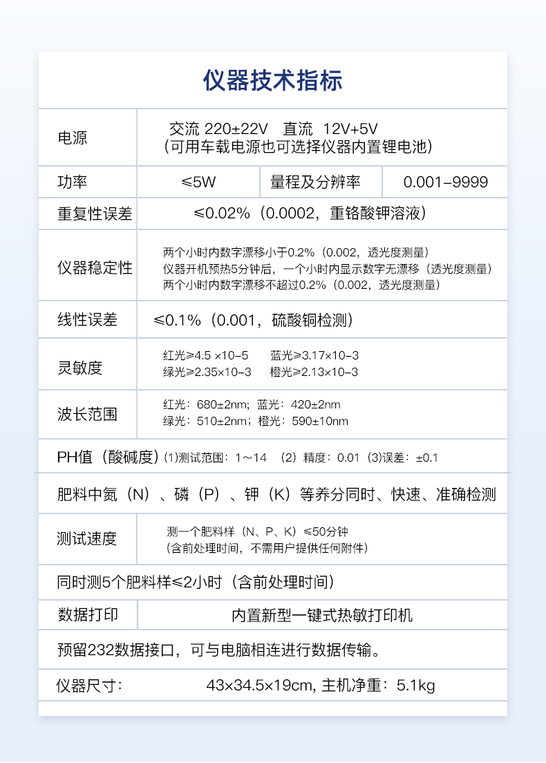 | 電源:交流 220±22V 直流 12V+5V(可用車載電源也可選擇儀器內(nèi)置鋰電池) | 功率: ≤5W | 量程及分辨率:0.001-9999 | 重復(fù)性誤差: ≤0.02%(0.0002,重鉻酸鉀溶液) | 儀器穩(wěn)定性:兩個小時內(nèi)數(shù)字漂移小于0.2%(0.002,透光度測量)。儀器開機(jī)預(yù)熱5分鐘后,一個小時內(nèi)顯示數(shù)字無漂移(透光度測量),兩個小時內(nèi)數(shù)字漂移不超過0.2%(0.002,透光度測量)。 | 線性誤差: ≤0.1%(0.001,硫酸銅檢測) | 靈敏度:紅光≥4.5 ×10-5 藍(lán)光≥3.17×10-3 綠光≥2.35×10-3 橙光≥2.13×10-3 | 波長范圍 :紅光:680±2nm; 藍(lán)光:420±2nm;綠光:510±2nm;橙光:590±10nm | PH值(酸堿度): (1)測試范圍:1~14 (2)精度:0.01 (3)誤差:±0.1 | 肥料中氮(N)、磷(P)、鉀(K)等養(yǎng)分同時、快速、準(zhǔn)確檢測 | 測試速度:測一個肥料樣(N、P、K)≤50分鐘(含前處理時間,不需用戶提供任何附件) | 同時測5個肥料樣≤2小時(含前處理時間) | 數(shù)據(jù)打?。簝?nèi)置新型一鍵式熱敏打印機(jī) | 預(yù)留232數(shù)據(jù)接口,可與電腦相連進(jìn)行數(shù)據(jù)傳輸。 | 儀器尺寸:43×34.5×19cm, 主機(jī)凈重:5.1kg |