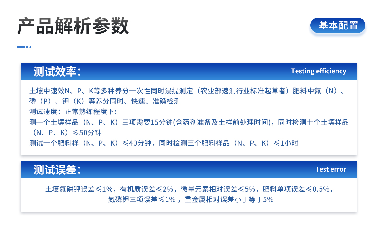 | 土壤氮磷鉀誤差≤1%,有機(jī)質(zhì)誤差≤2%,微量元素相對誤差≤5%;肥料單項(xiàng)誤差≤0.5%,氮磷鉀三項(xiàng)誤差≤1%。 | 重金屬相對誤差小于等于5%。 |
