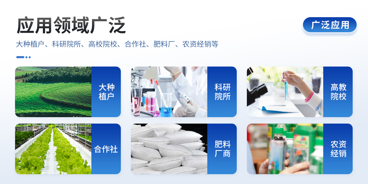 | 1、土壤養(yǎng)分:●土壤銨態(tài)氮、土壤有效磷、土壤速效鉀、土壤硝態(tài)氮、土壤水解氮、土壤全氮、土壤全磷、土壤全鉀、土壤有機(jī)質(zhì)(丘林法)、土壤有機(jī)質(zhì)(浸提法)、土壤總有機(jī)碳、土壤碳氮比、PH值、含鹽量、水分?!裢寥乐形⒘吭兀和寥棱}、土壤鎂、土壤硫、土壤硅、土壤硼、土壤鐵、土壤銅、土壤錳、土壤鋅、土壤氯、土壤鉬。 | 2、肥料養(yǎng)分:●單質(zhì)肥:氮肥中銨態(tài)氮、肥料硝態(tài)氮、尿素氮、縮二脲、磷肥中磷、磷肥中水溶性磷、鉀肥中鉀;●復(fù)合肥全氮、復(fù)合肥全磷、復(fù)合肥全鉀;●有機(jī)肥全氮、有機(jī)肥全磷、有機(jī)肥全鉀、有機(jī)肥硝態(tài)氮、有機(jī)肥速效磷、有機(jī)肥速效鉀、有機(jī)肥酸解氮、有機(jī)質(zhì);●水溶性腐植酸(風(fēng)化煤)、水溶性腐植酸(褐煤)、水溶性腐植酸(泥炭)、游離態(tài)腐植酸(風(fēng)化煤)、游離態(tài)腐植酸(褐煤)、游離態(tài)腐植酸(泥炭);●水溶肥全氮、水溶肥全磷、水溶肥全鉀;●葉面肥全氮、葉面肥全磷、葉面肥全鉀;●各種肥料微量元素:肥料鈣、肥料鎂、肥料硫、肥料硅、肥料硼、肥料鐵、肥料銅、肥料錳、肥料鋅、肥料氯、肥料鉬。 | 3、鮮作物營養(yǎng):●作物硝態(tài)氮、作物銨態(tài)氮、作物磷、作物鉀;●作物中微量元素:作物鈣、作物鎂、作物硫、作物硅、作物硼、作物鐵、作物銅、作物錳、作物鋅、作物氯、作物鉬;●作物中硝酸鹽、亞硝酸鹽。 | 4、干植株營養(yǎng):●植株全氮、植株全磷、植株全鉀 | 5、煙葉營養(yǎng):●全氮、全磷、全鉀、還原糖、水溶性總糖、硼、錳、鐵、銅、鈣、鎂等20項。 | 6、食品(水果、蔬菜等):●硝酸鹽、亞硝酸鹽、重金屬(鉛、鉻、鎘、砷、汞)等項。 | 7、水質(zhì)中:●銨態(tài)氮、水中磷、水中鉀、硝酸鹽、亞硝酸鹽、硬度、PH、鐵、銅、錳、鋅、硼、氯、硫、硅、鉬等 |