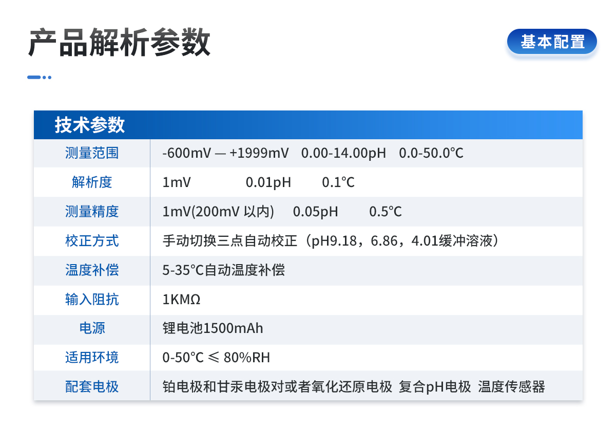 | 測(cè)量范圍:-600mV — +1999mV 0.00-14.00pH 0.0-50.0℃ | 解 析 度:1mV 0.01pH 0.1℃ | 測(cè)量精度:1mV(200mV 以內(nèi)) 0.05pH 0.5℃ | 校正方式:手動(dòng)切換三點(diǎn)自動(dòng)校正(pH9.18,6.86,4.01緩沖溶液) | 溫度補(bǔ)償:5-35℃自動(dòng)溫度補(bǔ)償 | 輸入阻抗:1KMΩ | 電 源:鋰電池1500mAh | 適用環(huán)境:0-50℃ ≤ 80%RH | 配套電極:鉑電極和甘汞電極對(duì)或者氧化還原電極 復(fù)合pH電極 溫度傳感器 | 電 源:4×12V AA電池,連續(xù)工作時(shí)間大于20小時(shí) | 測(cè)量時(shí)間:30-45min | 儀器尺寸:200×85×40 | 重 量:500g |