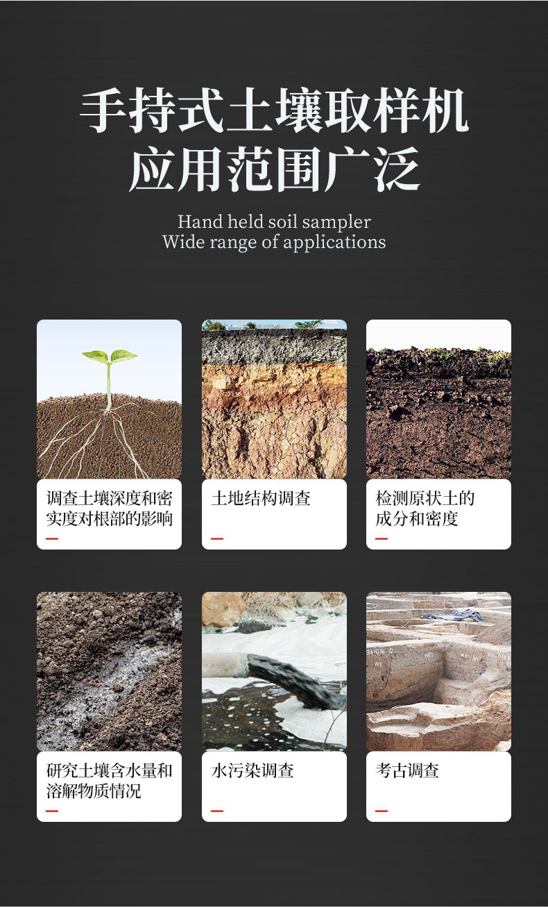 | 土壤結(jié)構(gòu)描述 | 調(diào)查根系情況,獲取深度和密實(shí)度對(duì)根部影響 | 檢測(cè)原狀土的成分和密度 | 對(duì)長(zhǎng)期作業(yè)的土壤研究其含水量和溶解物質(zhì)情況 | 對(duì)水的流動(dòng)和溶解物質(zhì)的研究,如土壤中水分快速流失現(xiàn)象 | 考古調(diào)查 |