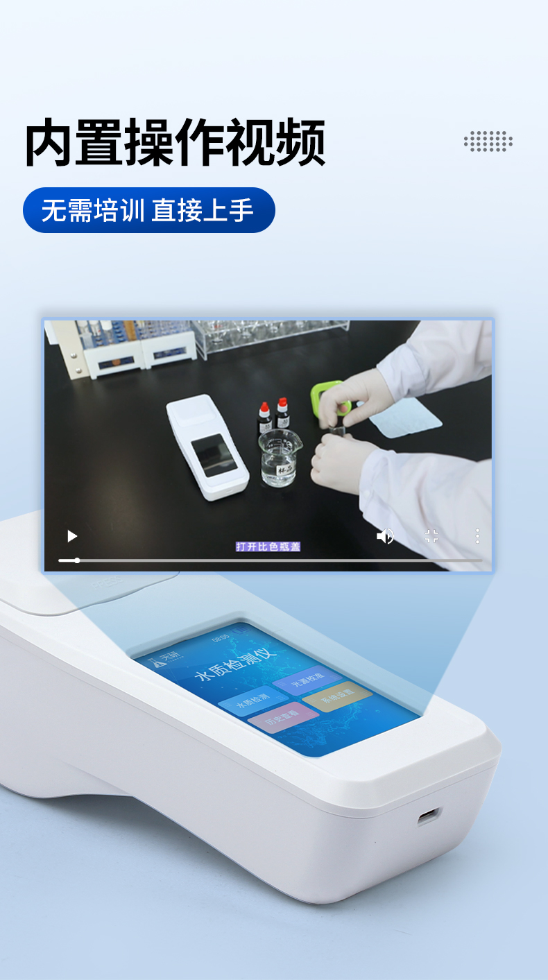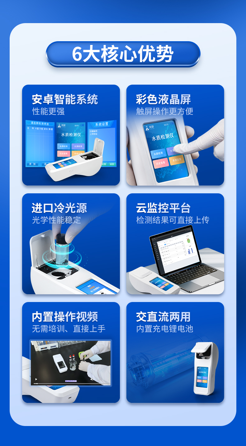 | 1、安卓智能系統(tǒng),操作更佳簡便快捷; | 2、配置云監(jiān)控平臺(tái),檢測結(jié)果可直接無線傳至平臺(tái),進(jìn)行水質(zhì)長短期分析,輔助管理; | 3、內(nèi)置操作流程、操作簡單、無需培訓(xùn)、直接上手; | 4、檢測速度更快,現(xiàn)場讀取數(shù)據(jù); | 5、便攜式體積小,重量輕,方便戶外檢測; | 6、外形小巧美觀,工作穩(wěn)定免維護(hù),具有較好的性價(jià)比; | 7、采用進(jìn)口冷光源,光學(xué)性能穩(wěn)定,壽命長達(dá)10萬小時(shí); | 8、交直流兩用,內(nèi)置充電鋰電池,環(huán)保耐用可支持連續(xù)室內(nèi)外工作。 |