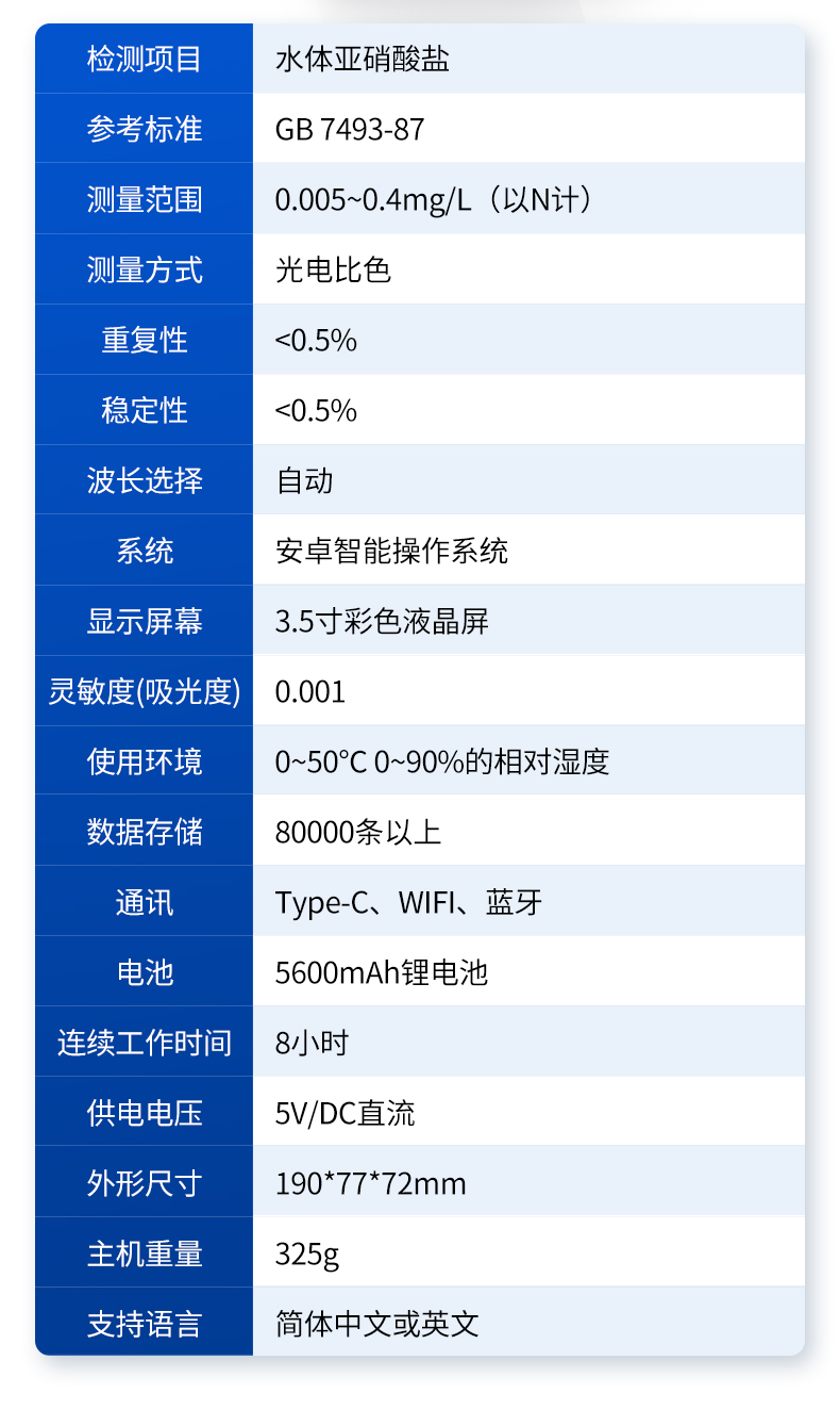 | 檢測項(xiàng)目:水體亞硝酸鹽; | 參考標(biāo)準(zhǔn):GB 7493-87; | 測量范圍:0.005~0.4mg/L(以N計(jì)); | 測量方式:光電比色; | 重復(fù)性:<0.5%; | 穩(wěn)定性:<0.5%; |