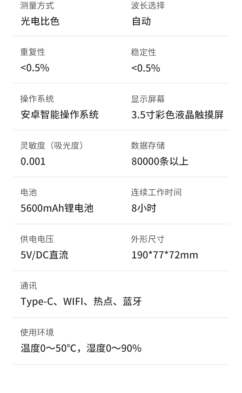 | 操作系統(tǒng):安卓智能操作系統(tǒng); | 顯示屏幕:3.5寸彩色液晶觸摸屏; | 靈敏度(吸光度):0.001; | 使用環(huán)境:溫度0~50℃,濕度0~90%; | 數(shù)據(jù)存儲(chǔ):80000條以上; |