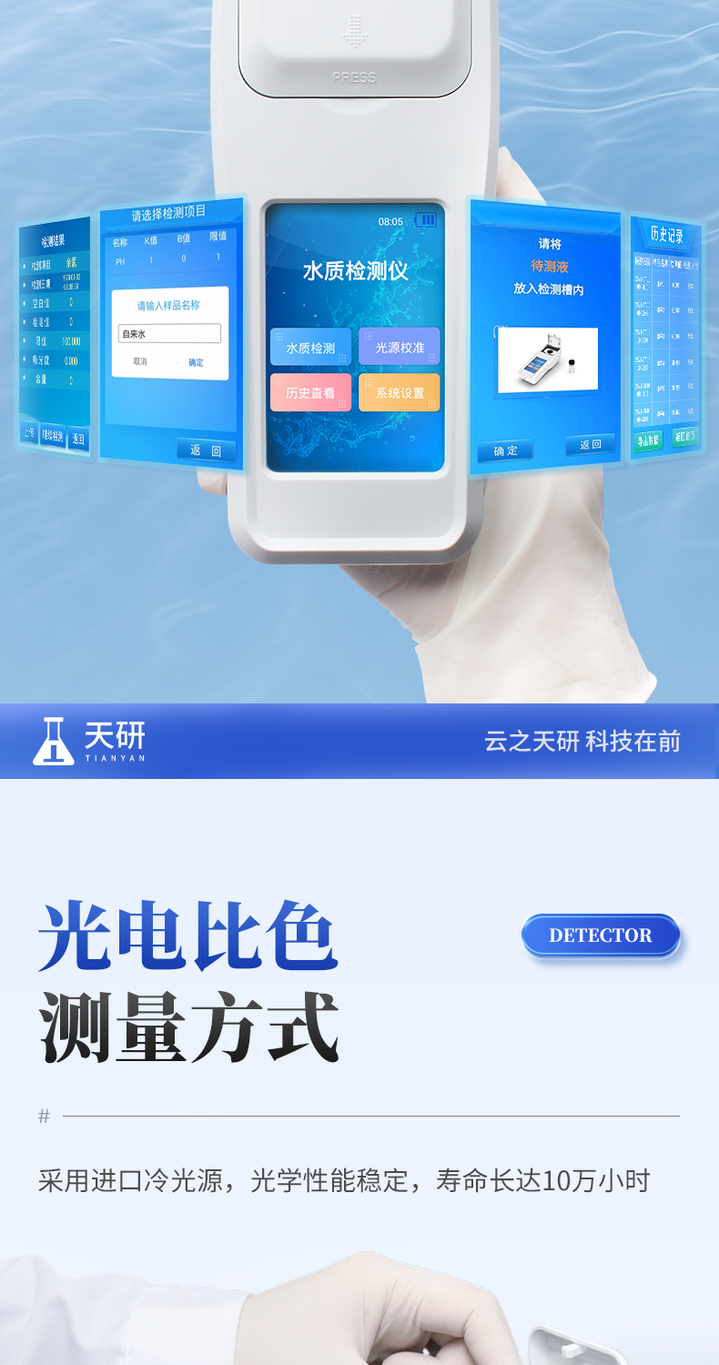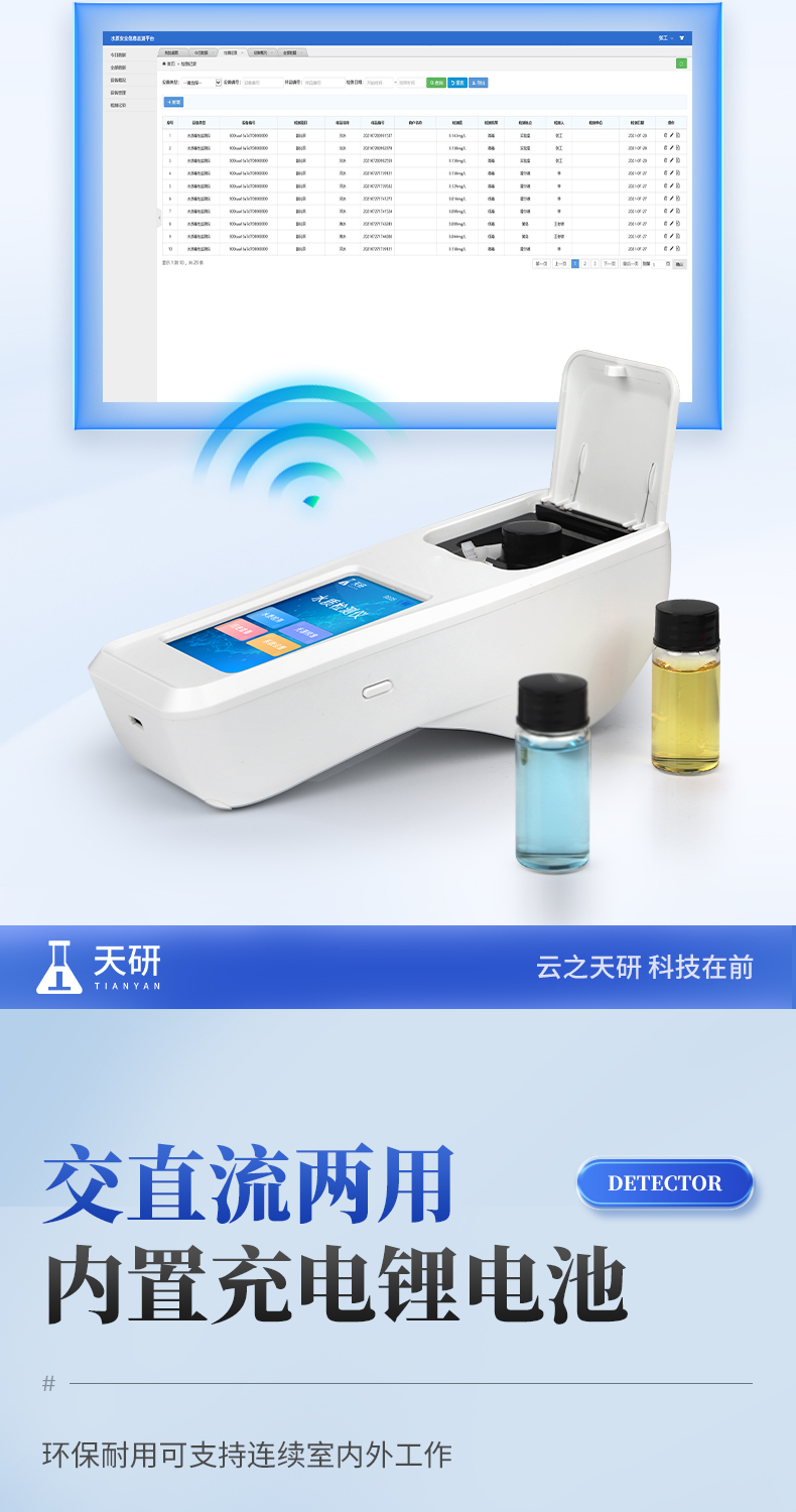 | 1、安卓智能系統(tǒng),操作更佳簡便快捷; | 2、配置云監(jiān)控平臺(tái),檢測結(jié)果可直接無線傳至平臺(tái),進(jìn)行水質(zhì)長短期分析,輔助管理; | 3、內(nèi)置操作流程、操作簡單、無需培訓(xùn)、直接上手; | 4、檢測速度更快,現(xiàn)場讀取數(shù)據(jù); | 5、便攜式體積小,重量輕,方便戶外檢測; | 6、外形小巧美觀,工作穩(wěn)定免維護(hù),具有較好的性價(jià)比; | 7、采用進(jìn)口冷光源,光學(xué)性能穩(wěn)定,壽命長達(dá)10萬小時(shí); | 8、交直流兩用,內(nèi)置充電鋰電池,環(huán)保耐用可支持連續(xù)室內(nèi)外工作。 |