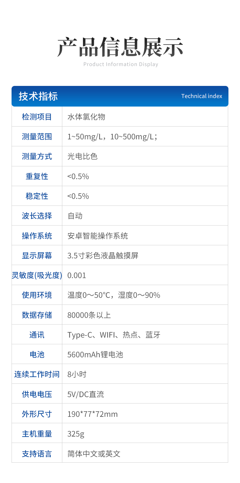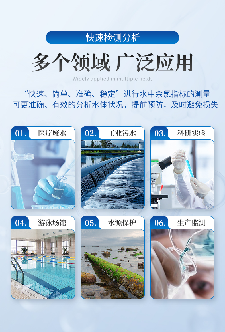 適用于純凈水廠、自來水廠、生活污水處理廠、醫(yī)療廢水、工業(yè)污水、游泳場館、水產(chǎn)養(yǎng)殖、河流監(jiān)測、水源保護、生產(chǎn)監(jiān)測、科研實驗等。