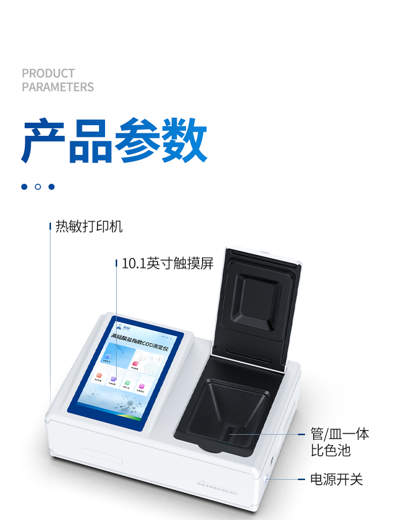 | 比色方式:比色管(16mm消解比色一體管)、比色皿(10mm、30mm、50mm); | 操作系統(tǒng):Android7.1.1智能操作系統(tǒng); | 操作界面:中文或英文操作界面; | 顯示屏:10.1英寸高清晰度彩色液晶觸摸屏; | 網(wǎng)絡(luò)接口:USB2.0、WiFi、藍(lán)牙、熱點(diǎn)、RJ45; | 云平臺(tái):儀器帶有監(jiān)管平臺(tái),連接有線/無(wú)線網(wǎng)絡(luò),檢測(cè)結(jié)果直接傳輸至環(huán)境安全監(jiān)管平臺(tái); | 打印機(jī):熱敏行式打印機(jī); | 數(shù)據(jù)儲(chǔ)存:800萬(wàn)組,可自由調(diào)用查看; | 數(shù)據(jù)導(dǎo)出格式:Excel表格; | 儀器尺寸:444 x 303 x 173 mm; | 儀器重量:5.2kg(不含適配器或充電器及電池); |