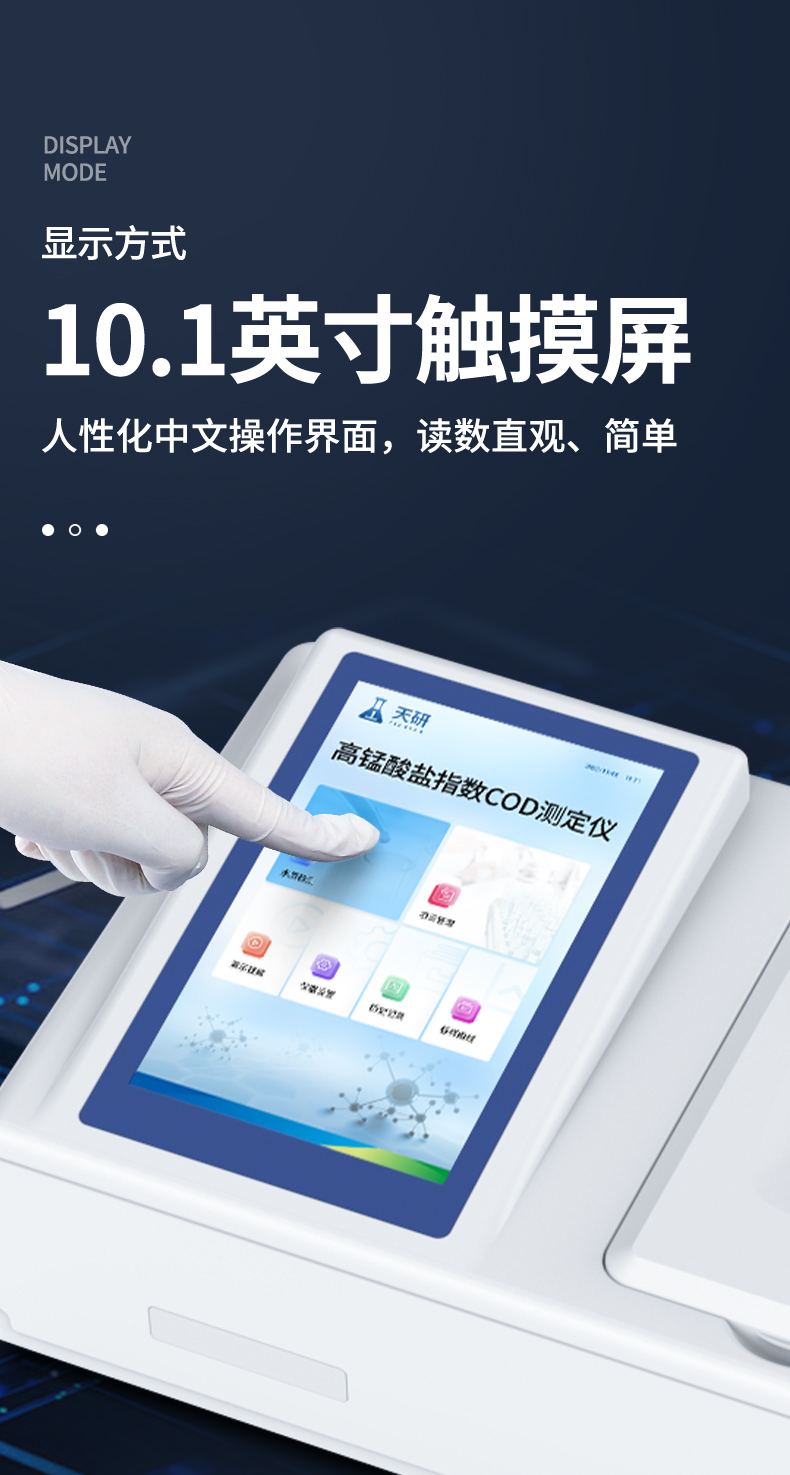 高錳酸鹽指數(shù)檢測(cè)儀(CODMn)是參考標(biāo)準(zhǔn)《GB/T 11892-1989 水質(zhì)高錳酸鹽指數(shù)的測(cè)定》設(shè)計(jì)制造,適用于國(guó)內(nèi)外眾多檢測(cè)標(biāo)準(zhǔn)。 本儀器采用錳法測(cè)定水中的COD指標(biāo),又稱CODMn或高錳酸鹽指數(shù),兼具智能數(shù)據(jù)分析功能,圖表、列表顯示數(shù)據(jù),分析一目了然;高清晰度彩色液晶觸摸顯示屏,Android智能操作系統(tǒng),中文顯示界面,中英文鍵盤,人性化操作,使用更簡(jiǎn)單。 廣泛適用于地表水、自來(lái)水等低含量COD的測(cè)定。