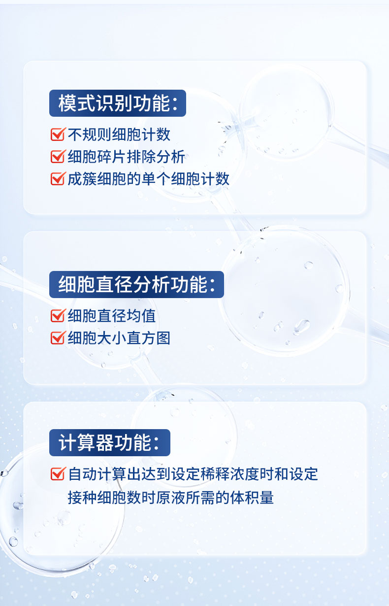 計(jì)數(shù)功能: 1、細(xì)胞總濃度和細(xì)胞總數(shù); 2、活細(xì)胞濃度和活細(xì)胞數(shù); 3、細(xì)胞存活率檢測(臺盼藍(lán)染色法); 模式識別功能: 1、細(xì)胞碎片排除分析; 2、成簇細(xì)胞的單個(gè)細(xì)胞計(jì)數(shù); 3、不規(guī)則細(xì)胞計(jì)數(shù); |