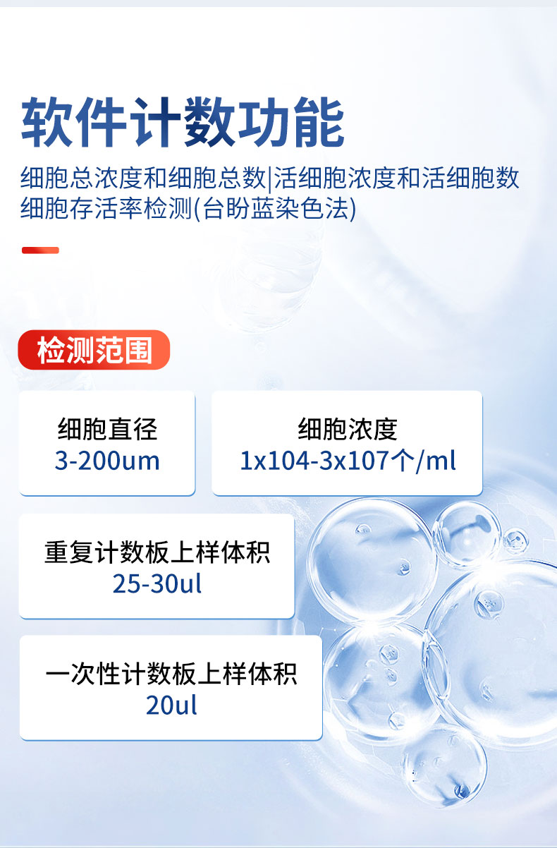 細(xì)胞計(jì)數(shù)儀簡述: 細(xì)胞計(jì)數(shù)儀通過細(xì)胞成像技術(shù)結(jié)合傳統(tǒng)血球計(jì)數(shù)原理,經(jīng)計(jì)數(shù)軟件對細(xì)胞分布圖像進(jìn)行自動(dòng)計(jì)數(shù)、細(xì)胞聚團(tuán)率分析、細(xì)胞活力分析、細(xì)胞大小分析,并繪制細(xì)胞大小柱狀圖等。該儀器檢測快速、操作簡單、結(jié)果準(zhǔn)確,可滿足多種細(xì)胞檢測場景需求。 主要特點(diǎn):