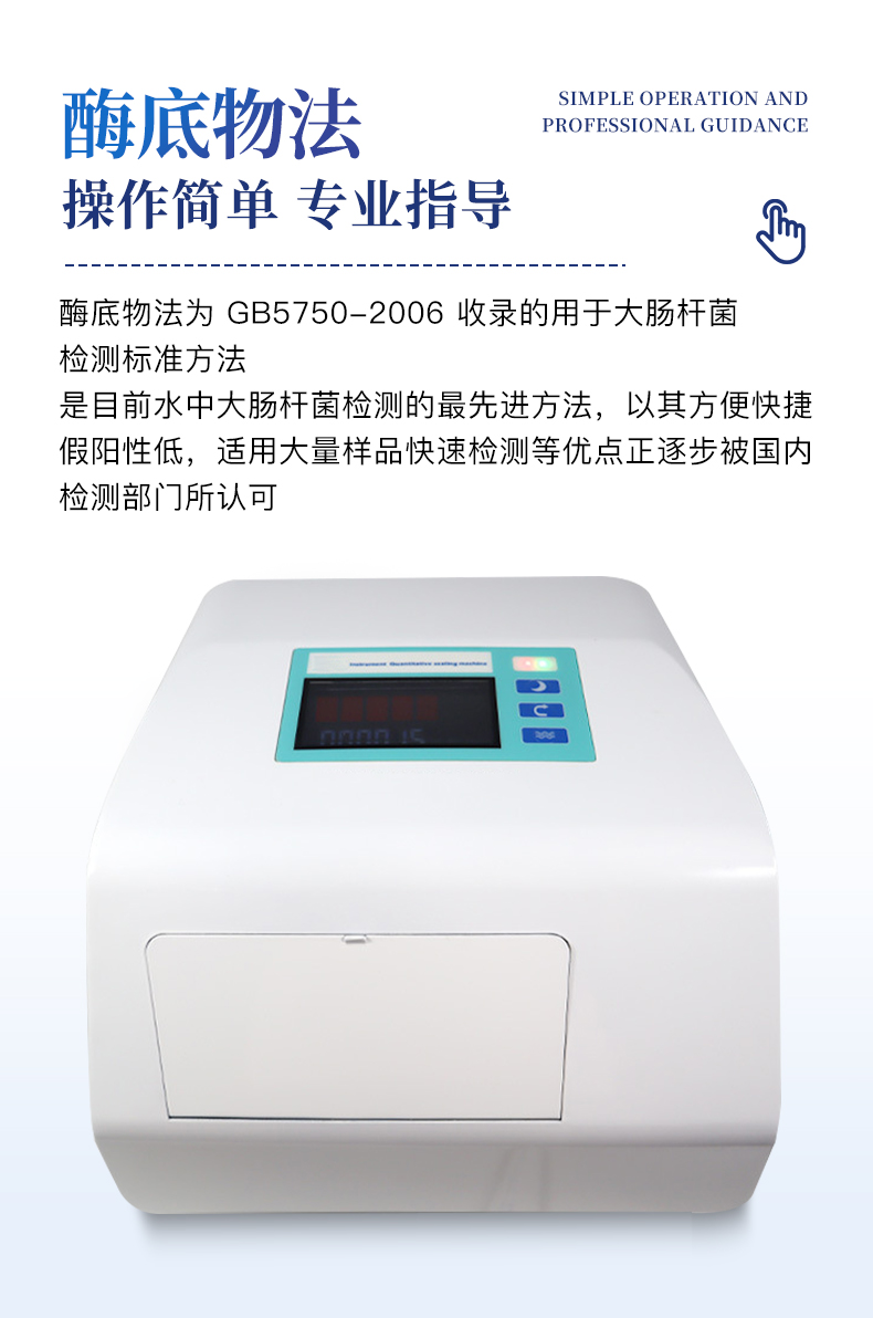 | 1、用于GB5750-2006,HJ1001-2018酶底物法檢測水質(zhì)總大腸菌群、大腸埃希氏菌,糞大腸菌群等 | 2、可靠性:無漏液,無破孔 | 3、穩(wěn)定性:可檢測50,000個樣品以上,使用壽命大于5年,具有ISO9001質(zhì)量認(rèn)證證書 | 4、方便性:有開/關(guān)及退格鍵、有定量盤計數(shù)、自動節(jié)能功能、有保潔窗口、錯誤提示功能 |