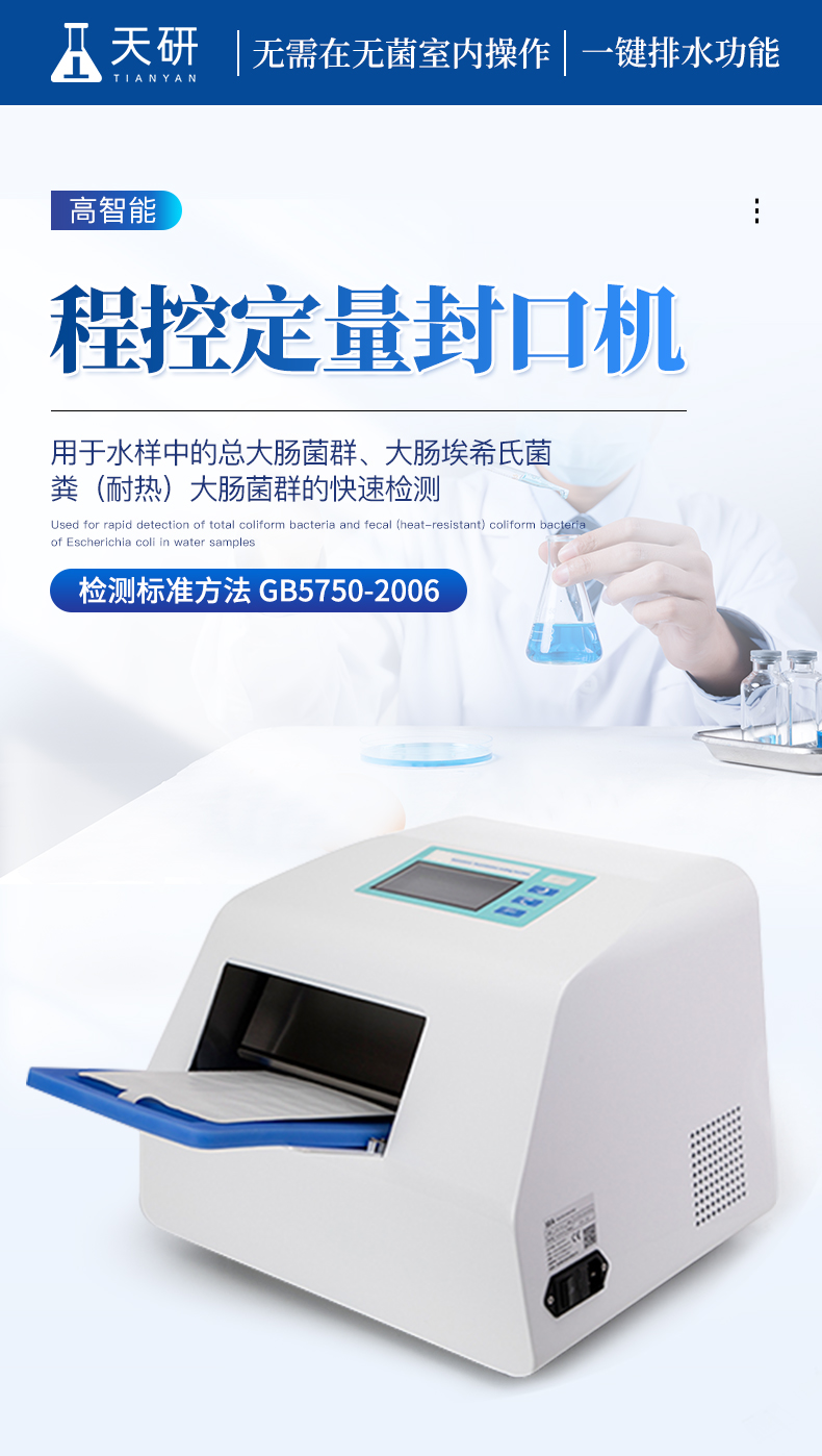 程控定量封口機由智能電路電驅(qū)動,內(nèi)部專用加熱輥,專門用于51孔定量盤和97孔定量盤封膜作用,配合微生物檢測試劑使用,提供簡單、快速、準(zhǔn)確的定量檢測總大腸菌群、大腸埃希氏菌、糞(耐熱)大腸菌群、腸球菌和綠膿假單胞菌的實驗方案;51孔定量盤和97孔定量盤是基于傳統(tǒng)方法最大可能數(shù)(MPN)統(tǒng)計模型而設(shè)計的半自動定量方法,可定量檢測出水樣結(jié)果,這種方法可以替代并優(yōu)于傳統(tǒng)(濾膜、及多管發(fā)酵)方法檢測水中微生物。