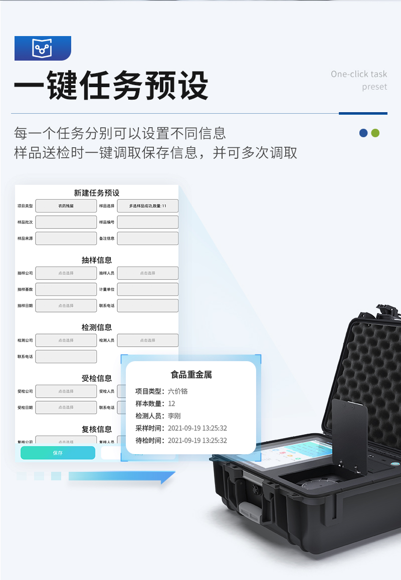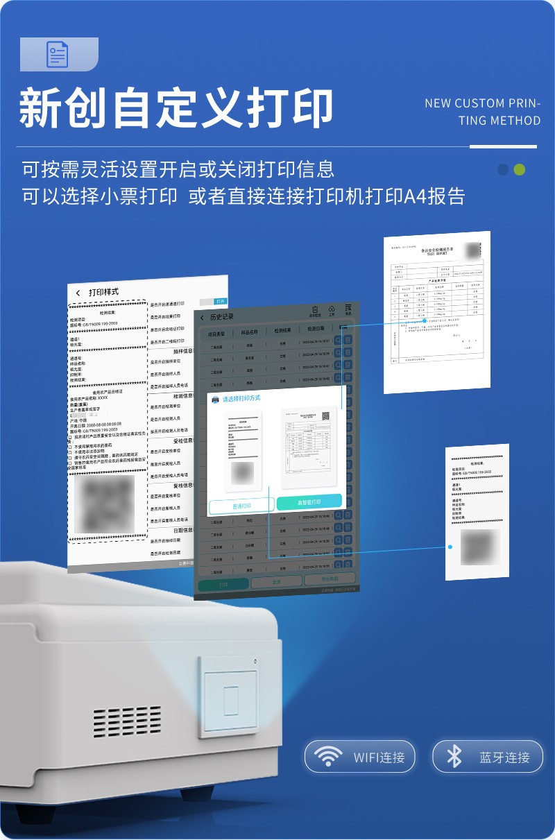 | 儀器采用臺式一體化系統(tǒng)檢測技術(shù),將分光光度模塊、數(shù)字化管理模塊、無線通訊模塊高度集成于一體,可支持檢測60種食品安全檢測項(xiàng)目,同時預(yù)留升級檢測方法。 | 儀器檢測模塊標(biāo)準(zhǔn)化、智能化,檢測項(xiàng)目可隨意自由組合。檢測箱體內(nèi)置多個標(biāo)準(zhǔn)檢測單元,檢測模塊可以調(diào)整配置。 | 儀器采用全新安卓智能系統(tǒng),主控芯片采用 ARM Cortex-A7,RK3288/4核處理器,10.1寸高清液晶觸摸豎屏,更加**的UI交互界面,運(yùn)轉(zhuǎn)快捷;儀器配備無線通信模塊: 4G(APN)通訊模塊、Wifi模塊,藍(lán)牙傳輸,同時具有雙USB接口以及RJ45接口能以多種方式實(shí)現(xiàn)數(shù)據(jù)保存和數(shù)據(jù)傳輸功能。 | 顯示屏幕:儀器采用10.1英寸豎向液晶觸摸屏顯,搭配運(yùn)行安卓智能操作系統(tǒng),主控芯片采用ARM Cortex-A7,RK3288/4核處理器,主頻1.88Ghz,操作方便,性能更強(qiáng)。 | 檢測通道:≥12通道;采用精密旋轉(zhuǎn)比色池設(shè)計,使用同芯片同光源校準(zhǔn)精度,解決不同光源之間的誤差值,更加準(zhǔn)確**。(1-12通道間誤差0.1%,專利號:ZL202022821055.2) | 儀器光源:高精度進(jìn)口四波長冷光源,每個通道均配置 410、520、590、630nm 波長光源,標(biāo)配**的光路切換裝置,專利光路切換功能可實(shí)現(xiàn)64波長,并且所有檢測項(xiàng)目可實(shí)現(xiàn)所有通道同時檢測。 | 設(shè)備可一鍵校準(zhǔn),自動保存校準(zhǔn)數(shù)據(jù),自動對比校驗(yàn),得到精準(zhǔn)光源,采用Android SP存儲數(shù)據(jù),光源數(shù)據(jù)永不丟失,方便每一次使用。 | 通訊接口:配備無線通信模塊、4G(APN)通訊模塊、藍(lán)牙傳輸,同時具有雙USB接口以及RJ45網(wǎng)線接口,可以多方式實(shí)現(xiàn)數(shù)據(jù)保存及數(shù)據(jù)傳輸。 | 存儲方式:支持U盤存儲,標(biāo)準(zhǔn)USB接口,免驅(qū)動安裝。檢測結(jié)果存儲容量20萬條以上,可生成Excel表格進(jìn)行拷貝,并具有登錄保護(hù)功能。 | 智能化操作系統(tǒng): | 1、操作系統(tǒng):儀器可在同一檢測界面自動對應(yīng)相關(guān)檢測通道,一次性選擇1-12個樣品名稱,無需退出界面,節(jié)省操作時間。并可以對每個通道屬性和樣品信息單獨(dú)進(jìn)行編輯,例如送檢單位、人員,檢測人員等,打印時勾選打印顯示。 | 2、數(shù)據(jù)集成系統(tǒng):設(shè)備首頁自動匯總分析檢測數(shù)據(jù),包含:周檢測數(shù)據(jù)、月檢測數(shù)據(jù),全部檢測總數(shù)量,均包含檢測總數(shù),合格數(shù),不合格數(shù),以及相關(guān)柱形分析圖,各項(xiàng)檢測數(shù)據(jù)一目了然,無需電腦查詢,更加快捷直觀。 | 3、數(shù)據(jù)庫系統(tǒng):十幾項(xiàng)數(shù)據(jù)庫分類管理儀器:包含項(xiàng)目類型、項(xiàng)目數(shù)據(jù)、檢測數(shù)據(jù)、歷史記錄、國標(biāo)信息、曲線信息、采樣信息、檢測信息、受檢信息、復(fù)核信息、圖表信息、光源校準(zhǔn)信息、打印樣式信息、樣品庫信息等等,數(shù)據(jù)庫之間互相協(xié)調(diào)聯(lián)動保證數(shù)據(jù)的真實(shí)完整性。同時產(chǎn)品數(shù)據(jù)庫以及歷史檢測記錄支持一鍵檢索功能。 | 4、限量規(guī)判系統(tǒng):具有限量查詢、添加物質(zhì)合規(guī)判定系統(tǒng)。檢測出結(jié)果后,系統(tǒng)自動調(diào)用系統(tǒng)數(shù)據(jù)庫中相關(guān)國標(biāo)進(jìn)行比對判定,客觀顯示判定結(jié)果是否合格。 | 5、項(xiàng)目預(yù)設(shè)系統(tǒng):儀器具有任務(wù)預(yù)設(shè)模塊,一鍵提前預(yù)設(shè),給出方便快捷的新檢測方案,每一個任務(wù)分別可以設(shè)置不同的樣品、批次、編號、來源、備注、抽樣信息、檢測信息、受檢信息、復(fù)核信息等更多信息。樣品送檢時一鍵調(diào)取保存信息,并可多次調(diào)取,大大提高檢測效率。 | 6、數(shù)據(jù)監(jiān)管系統(tǒng):同步對接監(jiān)管平臺,數(shù)據(jù)可局域網(wǎng)和互聯(lián)網(wǎng)數(shù)據(jù)上傳,檢測結(jié)果可選擇直接傳至食品安全監(jiān)管平臺。進(jìn)行區(qū)域食品安全監(jiān)管及大數(shù)據(jù)分析處理與數(shù)據(jù)統(tǒng)計,檢測區(qū)域食品安全長短期動態(tài),達(dá)到食品安全問題預(yù)估、預(yù)警。 | 7、全新打印系統(tǒng):內(nèi)置全新打印機(jī),新創(chuàng)自定義打印方式,可按需靈活勾選控制:二維碼,抽樣信息、檢測信息,受檢信息、復(fù)核信息、抽樣日期、檢測日期等信息的打印。 | 8、A4紙版本報告打印功能(可選配):設(shè)備擁有兩種結(jié)果展示方式,可以自動生成A4打印模板和小票打印模板兩種樣式,可通過WiFi及網(wǎng)線等方式鏈接外置打印機(jī)可進(jìn)行打印。 | 供電模式:儀器交直流兩用,直流12V供電,可連接車載電源,可配6ah大容量充電鋰電池,電量可實(shí)時顯示,方便戶外流動測試。 | 儀器具備遠(yuǎn)程升級功能,可定向分客戶分儀器更新,開機(jī)后自動更新,并可持續(xù)性免費(fèi)更新系統(tǒng)版本,無需像傳統(tǒng)產(chǎn)品返廠更新,節(jié)省時間及人力成本并避免了物流運(yùn)輸返廠升級導(dǎo)致設(shè)備損壞的潛在風(fēng)險。 |