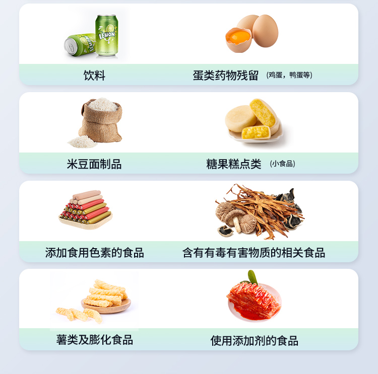 | 食品添加劑:二氧化硫、雙氧水、亞硝酸鹽、硝酸鹽、苯甲酸鈉、山梨酸鉀、糖精鈉、甜蜜素、木耳硫酸鎂等 | 有毒有害物質(zhì):甲醛、吊白塊、硼砂、過氧化苯甲酰、溴酸鉀、羅丹明B、三聚氰胺、蘇丹紅、工業(yè)堿、尿素、明礬等 | 食用油脂:過氧化值、酸價等 | 果蔬:農(nóng)藥殘留(酶抑制率法) | 病害肉:組胺、揮發(fā)性鹽基氮 | 重金屬含量: 鉛、鎘、鉻、汞、砷、錫、鎳、鋁等 | 瘦肉精激素:鹽酸克倫特羅、沙丁胺醇、萊克多巴胺、己烯雌酚等 | 抗生素殘留:四環(huán)素類、硝基呋喃類、磺胺類、β-興奮劑類、沙星類、磺胺類、喹諾酮類,甲砜霉素,氟苯尼考,金剛烷胺、替米考星、慶大霉素、林可霉素、鏈霉素、恩諾沙星、環(huán)丙沙星、頭孢啦啶、青霉素、阿莫西林等 | 水產(chǎn)品安全類:孔雀石綠、氯霉素、呋喃妥因、呋喃西林、呋喃它酮、呋喃唑酮等 | 蛋類藥物殘留:氯霉素,四環(huán)素,磺胺類,喹諾酮類,呋喃西林,呋喃它酮,呋喃妥因,呋喃唑酮,氟苯尼考,阿莫西林、頭孢氨芐、紅霉素、鏈霉素等 | 真菌毒素殘留:食用油、糧食及飼料中黃曲霉毒素B1、黃曲霉毒素總量,奶中黃曲霉毒素M1、嘔吐毒素、玉米赤霉烯酮、赭曲霉毒素A、T2毒素、伏馬毒素等 | 水酒飲品分析:酒中甲醇、乙醇、乳品及牛奶中蛋白質(zhì), | 蜂蜜成分:果糖和葡萄糖、蔗糖、淀粉酶、酸度等 | 調(diào)味品成分:食醋的總酸、醬油的總酸、芝麻油純度、谷氨酸鈉、醬油氨基酸態(tài)氮、食鹽中亞鐵氰化鉀、食鹽中碘等 | 食用色素類:紅色色素(胭脂紅、莧菜紅、莧菜紅)、黃色色素(檸檬黃、日落黃)、藍色色素(亮藍)等 | 動物疫病類:禽流感、新城疫、牛羊口蹄疫、牛羊結(jié)核病、牛羊包蟲、牛羊布病、小反芻獸、豬藍耳病毒、豬瘟病毒、豬偽狂犬病毒、豬細小、豬圓環(huán)、犬細小病毒、犬瘟熱病毒、犬狂犬病毒等 |