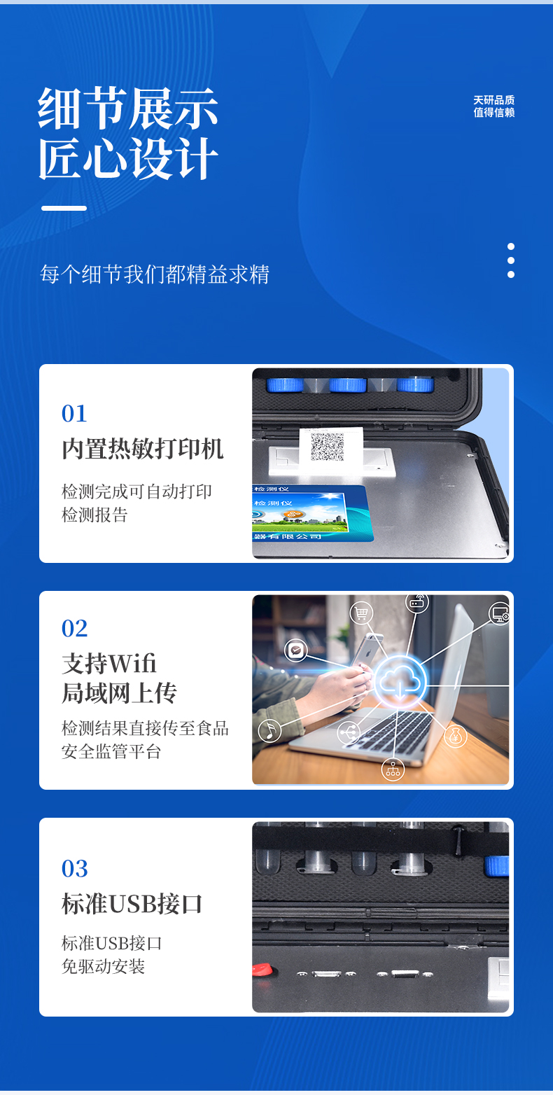 | 安卓智能操作系統(tǒng),采用更加**UI交互界面,儀器具有wifi聯(lián)網(wǎng)上傳、4G聯(lián)網(wǎng)傳輸、GPRS無線遠傳、網(wǎng)線連接功能,快速批量上傳數(shù)據(jù)。 | 智能化程度高,儀器具有自檢功能:具有開機自檢和調(diào)零功能,具有自動檢測重復(fù)性功能。 | 新一代高速熱敏打印機,檢測完成可自動打印檢測報告和二維碼。 | 儀器帶有監(jiān)管平臺,數(shù)據(jù)可局域網(wǎng)和互聯(lián)網(wǎng)數(shù)據(jù)上傳,檢測結(jié)果直接傳至食品安全監(jiān)管平臺。進行區(qū)域食品安全監(jiān)管及大數(shù)據(jù)分析處理與數(shù)據(jù)統(tǒng)計,檢測區(qū)域食品安全長短期動態(tài),達到食品安全問題預(yù)估、預(yù)警 | 一體化便攜式快檢設(shè)備,滿足現(xiàn)場及流動檢測使用需求,能夠在同一軟件下實現(xiàn)所有檢測項目的檢測,并可通過同一窗口直觀顯示檢測結(jié)果。 | 膠體金模塊檢測方式:軌道式自動傳輸掃描,檢測完成后自動退出檢測卡。 | 一體化主機,包含食品安全檢測模塊、多通道農(nóng)藥殘留檢測模塊、膠體金免疫層析檢測模塊。 | CT線自動識別,無需手動調(diào)整。 | 儀器具有品類多種類樣品菜單庫,可靈活選擇檢測樣品,不同的檢測通道可同時檢測不同的樣品項目。。 | 樣品處理簡單省力,整體操作快速、安全、便捷。 | 儀器具有自身保護功能,可設(shè)置用戶名及密碼,防止非工作人員操作等。 | 高靈敏度,高檢測精度,高重復(fù)性精度,掃描式高精度光學(xué)傳感器。 | 儀器具有重新校準(zhǔn)、鎖定、恢復(fù)出廠設(shè)置功能。 | 內(nèi)置強大的數(shù)據(jù)庫,可在儀器上直接選擇樣品名稱、檢測指標(biāo)、送檢單位等信息,也可在儀器上直接編輯錄入樣品名稱、檢測指標(biāo)、送檢單位等信息并保存進樣品數(shù)據(jù)庫。 | 儀器具有重新校準(zhǔn)、鎖定、恢復(fù)出廠設(shè)置功能。 | 結(jié)果判定線可修改,對照值標(biāo)定值可保存,斷電不丟失數(shù)據(jù)。 | 兼容市場上所有的膠體金卡,使用耗材不受限制,極大增強用戶使用體驗。 |