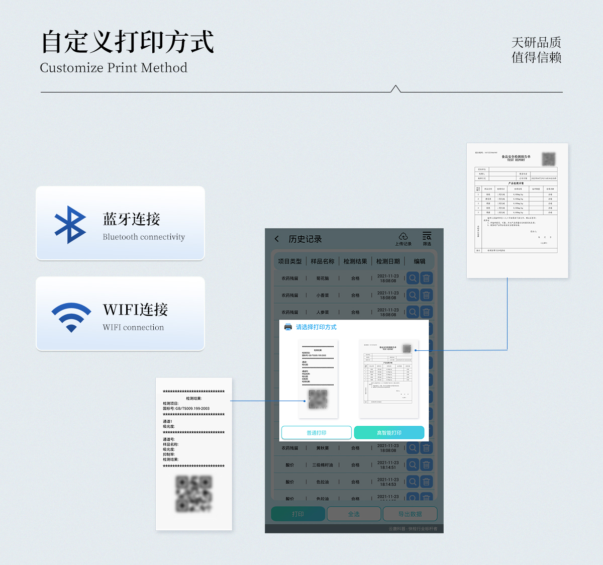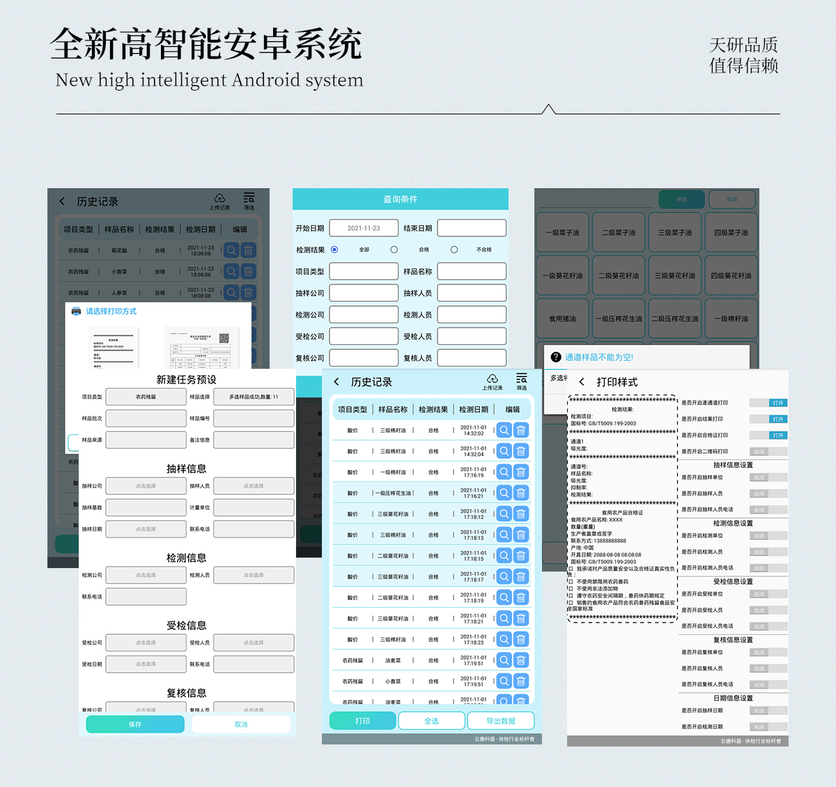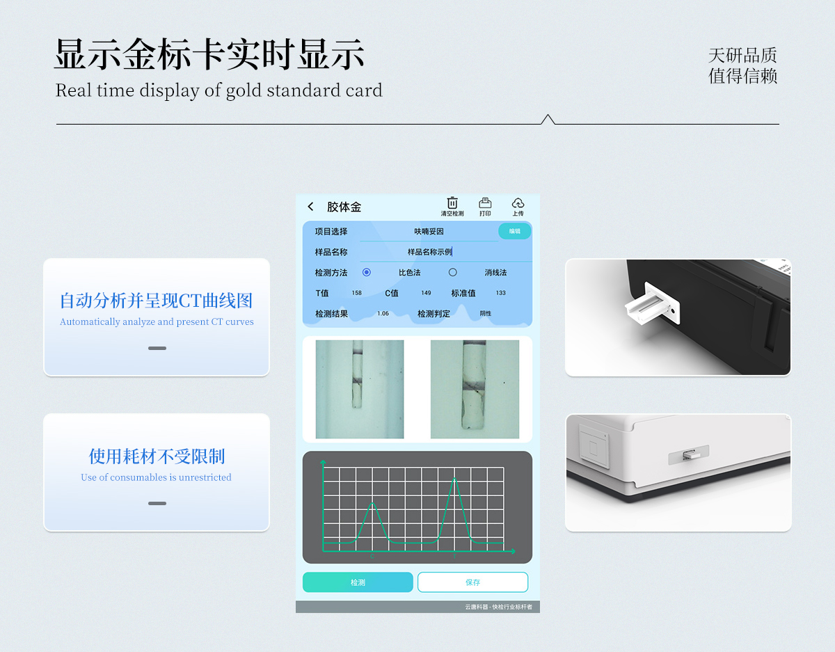 | 儀器采用手提一體化系統(tǒng)檢測技術(shù),將分光光度模塊、膠體金檢測模塊、新型農(nóng)殘檢測模塊、數(shù)字化管理模塊、無線通訊模塊高度集成于一體,支持檢測200種食品安全檢測項目,同時預(yù)留升級檢測方法。 | 儀器檢測模塊標(biāo)準(zhǔn)化、智能化,檢測項目可隨意自由組合。檢測箱體內(nèi)置多個標(biāo)準(zhǔn)檢測單元,檢測模塊可以調(diào)整配置。 | 顯示屏幕:儀器采用10.1英寸豎向液晶觸摸屏顯,搭配運行安卓智能操作系統(tǒng),主控芯片采用ARM Cortex-A7,RK3288/4核處理器,主頻1.88Ghz,操作方便,性能更強。 | 檢測通道:≥12通道;采用精密旋轉(zhuǎn)比色池設(shè)計,使用同芯片同光源校準(zhǔn)精度,解決不同光源之間的誤差值,更加準(zhǔn)確**。(1-12通道間誤差0.1%,專利號:ZL202022821055.2) | 儀器光源:高精度進(jìn)口四波長冷光源,每個通道均配置 410、520、590、630nm 波長光源,標(biāo)配**的光路切換裝置,專利光路切換功能可實現(xiàn)64波長,并且所有檢測項目可實現(xiàn)所有通道同時檢測。 | 設(shè)備可一鍵校準(zhǔn),自動保存校準(zhǔn)數(shù)據(jù),自動對比校驗,得到精準(zhǔn)光源,采用Android SP存儲數(shù)據(jù),光源數(shù)據(jù)永不丟失,方便每一次使用。 | 通訊接口:配備無線通信模塊、4G(APN)通訊模塊、藍(lán)牙傳輸,同時具有雙USB接口以及RJ45網(wǎng)線接口,可以多方式實現(xiàn)數(shù)據(jù)保存及數(shù)據(jù)傳輸。 | 存儲方式:支持U盤存儲,標(biāo)準(zhǔn)USB接口,免驅(qū)動安裝。檢測結(jié)果存儲容量20萬條以上,可生成Excel表格進(jìn)行拷貝,并具有登錄保護(hù)功能。 | 智能化操作系統(tǒng):: ★操作系統(tǒng):儀器可在同一檢測界面自動對應(yīng)相關(guān)檢測通道,一次性選擇1-12個樣品名稱,無需退出界面,節(jié)省操作時間。并可以對每個通道屬性和樣品信息單獨進(jìn)行編輯,例如送檢單位、人員,檢測人員等,打印時勾選打印顯示。 | ★數(shù)據(jù)集成系統(tǒng):設(shè)備首頁自動匯總分析檢測數(shù)據(jù),包含:周檢測數(shù)據(jù)、月檢測數(shù)據(jù),全部檢測總數(shù)量,均包含檢測總數(shù),合格數(shù),不合格數(shù),以及相關(guān)柱形分析圖,各項檢測數(shù)據(jù)一目了然,無需電腦查詢,更加快捷直觀。 | ★數(shù)據(jù)庫系統(tǒng):十幾項數(shù)據(jù)庫分類管理儀器:包含項目類型、項目數(shù)據(jù)、檢測數(shù)據(jù)、歷史記錄、國標(biāo)信息、曲線信息、采樣信息、檢測信息、受檢信息、復(fù)核信息、圖表信息、光源校準(zhǔn)信息、打印樣式信息、樣品庫信息等等,數(shù)據(jù)庫之間互相協(xié)調(diào)聯(lián)動保證數(shù)據(jù)的真實完整性。同時產(chǎn)品數(shù)據(jù)庫以及歷史檢測記錄支持一鍵檢索功能。 | ★限量規(guī)判系統(tǒng):具有限量查詢、添加物質(zhì)合規(guī)判定系統(tǒng)。檢測出結(jié)果后,系統(tǒng)自動調(diào)用系統(tǒng)數(shù)據(jù)庫中相關(guān)國標(biāo)進(jìn)行比對判定,客觀顯示判定結(jié)果是否合格 | ★項目預(yù)設(shè)系統(tǒng):儀器具有任務(wù)預(yù)設(shè)模塊,一鍵提前預(yù)設(shè),給出方便快捷的新檢測方案,每一個任務(wù)分別可以設(shè)置不同的樣品、批次、編號、來源、備注、抽樣信息、檢測信息、受檢信息、復(fù)核信息等更多信息。樣品送檢時一鍵調(diào)取保存信息,并可多次調(diào)取,大大提高檢測效率。 | ★數(shù)據(jù)監(jiān)管系統(tǒng):同步對接監(jiān)管平臺,數(shù)據(jù)可局域網(wǎng)和互聯(lián)網(wǎng)數(shù)據(jù)上傳,檢測結(jié)果可選擇直接傳至食品安全監(jiān)管平臺。進(jìn)行區(qū)域食品安全監(jiān)管及大數(shù)據(jù)分析處理與數(shù)據(jù)統(tǒng)計,檢測區(qū)域食品安全長短期動態(tài),達(dá)到食品安全問題預(yù)估、預(yù)警。 | ★打印系統(tǒng):內(nèi)置全新打印機,新創(chuàng)自定義打印方式,可按需靈活勾選控制:產(chǎn)品合格證(國家農(nóng)業(yè)部標(biāo)準(zhǔn)要求),二維碼,抽樣信息、檢測信息,受檢信息、復(fù)核信息、抽樣日期、檢測日期等信息的打印。 | 供電模式:儀器交直流兩用,直流12V供電,可連接車載電源,可配6ah大容量充電鋰電池,電量可實時顯示,方便戶外流動測試。 | 膠體金檢測模塊:采用雙通道CMOS成像處理技術(shù)及膠體金免疫層析技術(shù),可同時讀取雙膠體金卡數(shù)據(jù),自動采集、處理分析,將檢測結(jié)果顯示,并可根據(jù)參考限值自動判斷檢測結(jié)果,可檢測常見的獸藥殘留、生物毒素、抗生素、違禁添加物等。 | ★探測技術(shù):CMOS成像探測; | ★檢測通道:1個通道; | ★檢測方式:消線法和比色法; | ★顯示模式:陰性或陽性; | 曲線形式:軌道式掃描方式,顯示金標(biāo)卡圖像,實時生成、識別CT曲線圖,無需手動調(diào)整,完成檢測后自動退出檢測卡。兼容市場上其他金標(biāo)卡,使用耗材不受限制。 | 儀器具備遠(yuǎn)程升級功能,可定向分客戶分儀器更新,開機后自動更新,并可持續(xù)性免費更新系統(tǒng)版本,無需像傳統(tǒng)產(chǎn)品返廠更新,節(jié)省時間及人力成本并避免了物流運輸返廠升級導(dǎo)致設(shè)備損壞的潛在風(fēng)險。 |