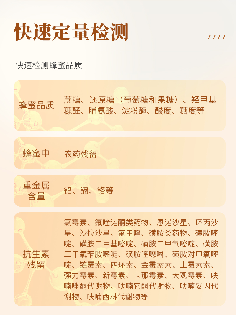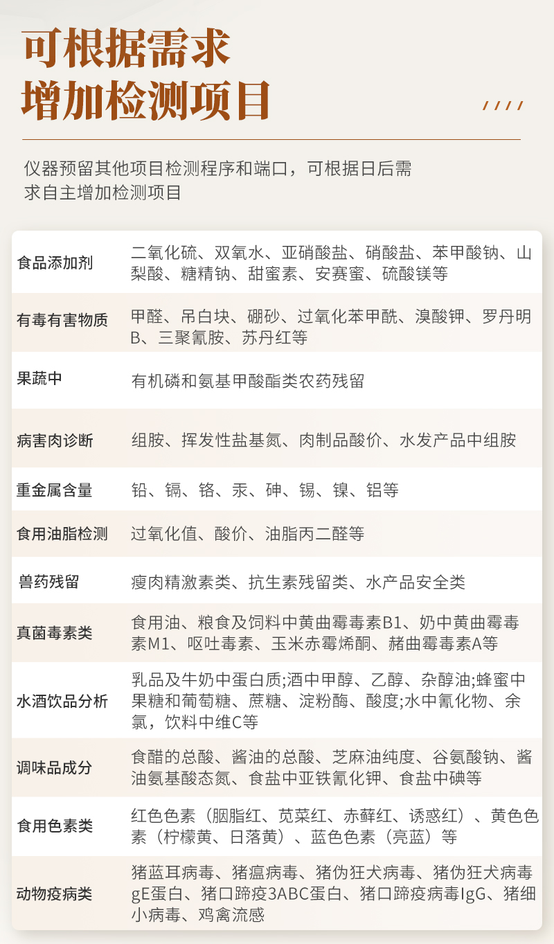 | 食品添加劑:二氧化硫、雙氧水、亞硝酸鹽、硝酸鹽、苯甲酸鈉、山梨酸鉀、糖精鈉、甜蜜素、木耳硫酸鎂等 | 有毒有害物質:甲醛、吊白塊、硼砂、過氧化苯甲酰、溴酸鉀、羅丹明B、三聚氰胺、蘇丹紅、工業(yè)堿、尿素、明礬等 | 食用油脂:過氧化值、酸價等 | 果蔬:農藥殘留(酶抑制率法) | 病害肉:組胺、揮發(fā)性鹽基氮 | 重金屬含量:鉛、鎘、鉻、汞、砷、錫、鎳、鋁等 | 水酒飲品分析:酒中甲醇、乙醇、乳品及牛奶中蛋白質, | 蜂蜜成分:果糖和葡萄糖、蔗糖、淀粉酶、酸度等 | 調味品成分:食醋的總酸、醬油的總酸、芝麻油純度、谷氨酸鈉、醬油氨基酸態(tài)氮、食鹽中亞鐵氰化鉀、食鹽中碘等 | 食用色素類:紅色色素(胭脂紅、莧菜紅、莧菜紅)、黃色色素(檸檬黃、日落黃)、藍色色素(亮藍)等 |