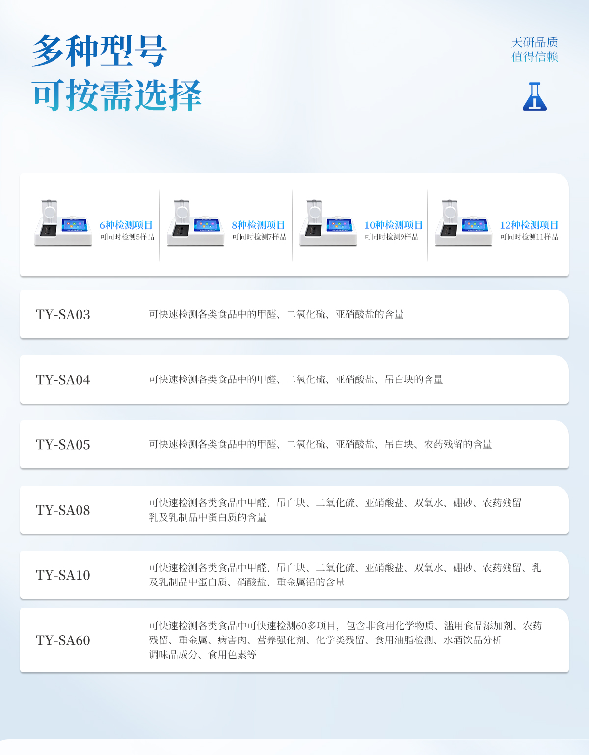 產(chǎn)品介紹:多功能食品安全檢測儀可快速檢測200多項目,包含非食用化學(xué)物質(zhì)、濫用食品添加劑、農(nóng)藥殘留、獸藥殘留、重金屬、病害肉、營養(yǎng)強(qiáng)化劑、抗生素類殘留、激素類殘留、真菌毒素類殘留、化學(xué)類殘留等現(xiàn)場的定性定量檢測。該多功能食品安全檢測儀為集成化食品安全快速檢測分析設(shè)備,廣泛應(yīng)用于市場監(jiān)管局、檢測中心、衛(wèi)生