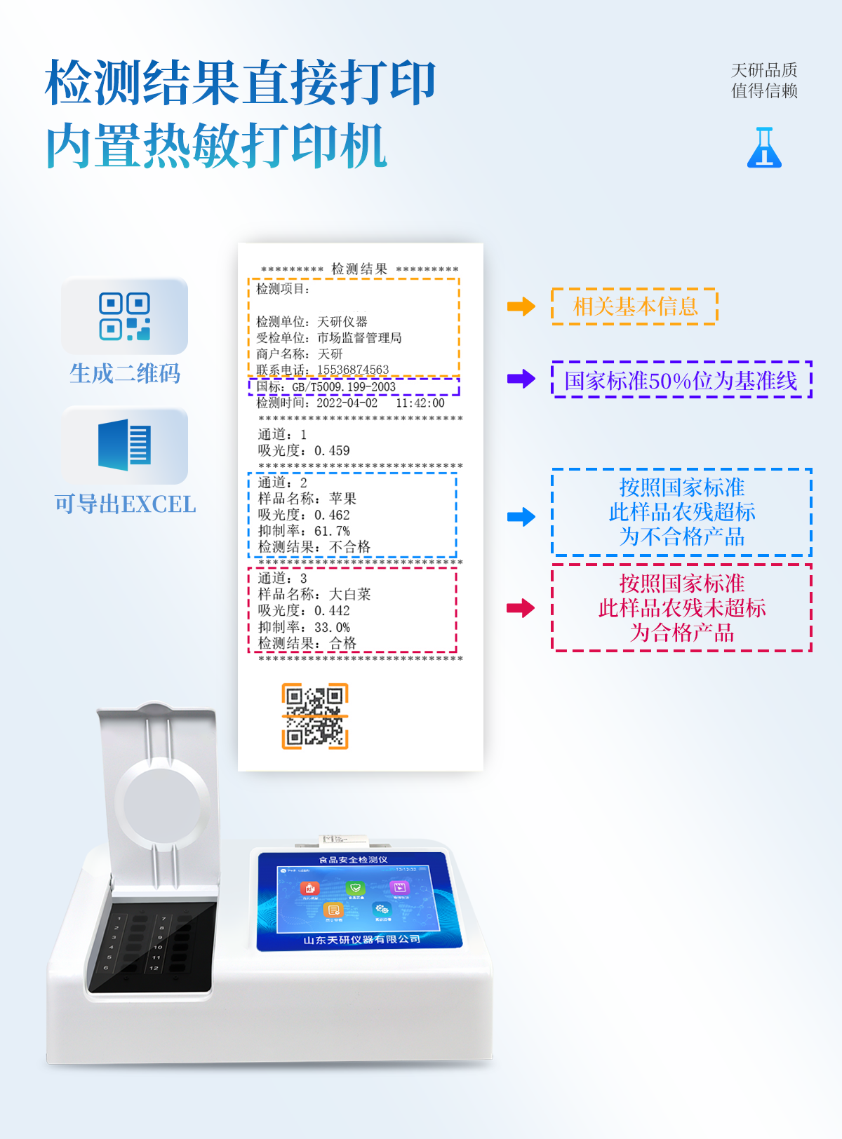 | 安卓智能操作系統(tǒng),采用更加**和人性化操作,儀器具有網(wǎng)線連接、wifi聯(lián)網(wǎng)上傳、GPRS無線遠(yuǎn)傳功能,快速上傳數(shù)據(jù)。 | 智能化程度高,儀器具有自檢功能:具有開機(jī)自檢和調(diào)零功能,具有自動檢測重復(fù)性功能。 | 檢測通道:≥12個檢測通道,可以同時測試多個樣品,每個樣品由程序控制分別獨立工作,不會互相干擾。 | 顯示方式:≥8英寸液晶觸摸屏顯示,人性化中文操作界面,讀數(shù)直觀、簡單。 | 配備新一代嵌入式熱敏打印機(jī),可選擇手動打印或者自動打印,檢測完成可自動打印檢測報告和二維碼。 | 光源采用進(jìn)口超高亮發(fā)光二極管,高精度、穩(wěn)定性強(qiáng)、光源可控、可以關(guān)掉不使用的光源,功耗更低。 | 采用USB2.0接口設(shè)計,方便數(shù)據(jù)的存貯和移動,并可隨時與計算機(jī)直接相連,并且可用計算機(jī)控制儀器。實現(xiàn)數(shù)據(jù)查詢、瀏覽、分析、統(tǒng)計、打印等。 | 儀器帶有監(jiān)管平臺。數(shù)據(jù)可局域網(wǎng)和互聯(lián)網(wǎng)數(shù)據(jù)上傳,檢測結(jié)果直接傳至食品安全監(jiān)管平臺。進(jìn)行區(qū)域食品安全監(jiān)管及大數(shù)據(jù)分析處理,檢測區(qū)域食品安全長短期動態(tài),達(dá)到食品安全問題預(yù)估、預(yù)警 | 一體化便攜式快檢設(shè)備,滿足現(xiàn)場及流動檢測使用需求,能夠在同一軟件下實現(xiàn)所有檢測項目的檢測,并可通過同一窗口直觀顯示檢測結(jié)果。 | 儀器具有多品類多種類樣品菜單庫,可靈活選擇檢測樣品,不同的檢測通道可同時檢測不同的樣品項目。也可在儀器上直接編輯錄入樣品名稱、檢測指標(biāo)、送檢單位等信息并保存進(jìn)樣品數(shù)據(jù)庫。 | 樣品處理簡單省力,整體操作快速、安全、便捷。 | 儀器具有自身保護(hù)功能,可設(shè)置用戶名及密碼,防止非工作人員操作等。 | 高靈敏度,高檢測精度,高重復(fù)性精度,掃描式高精度光學(xué)傳感器。 | 儀器具有重新校準(zhǔn)、鎖定、恢復(fù)出廠設(shè)置功能。 | 支持U盤存儲。 結(jié)果判定線可修改,對照值標(biāo)定值可保存,斷電不丟失數(shù)據(jù)。 |